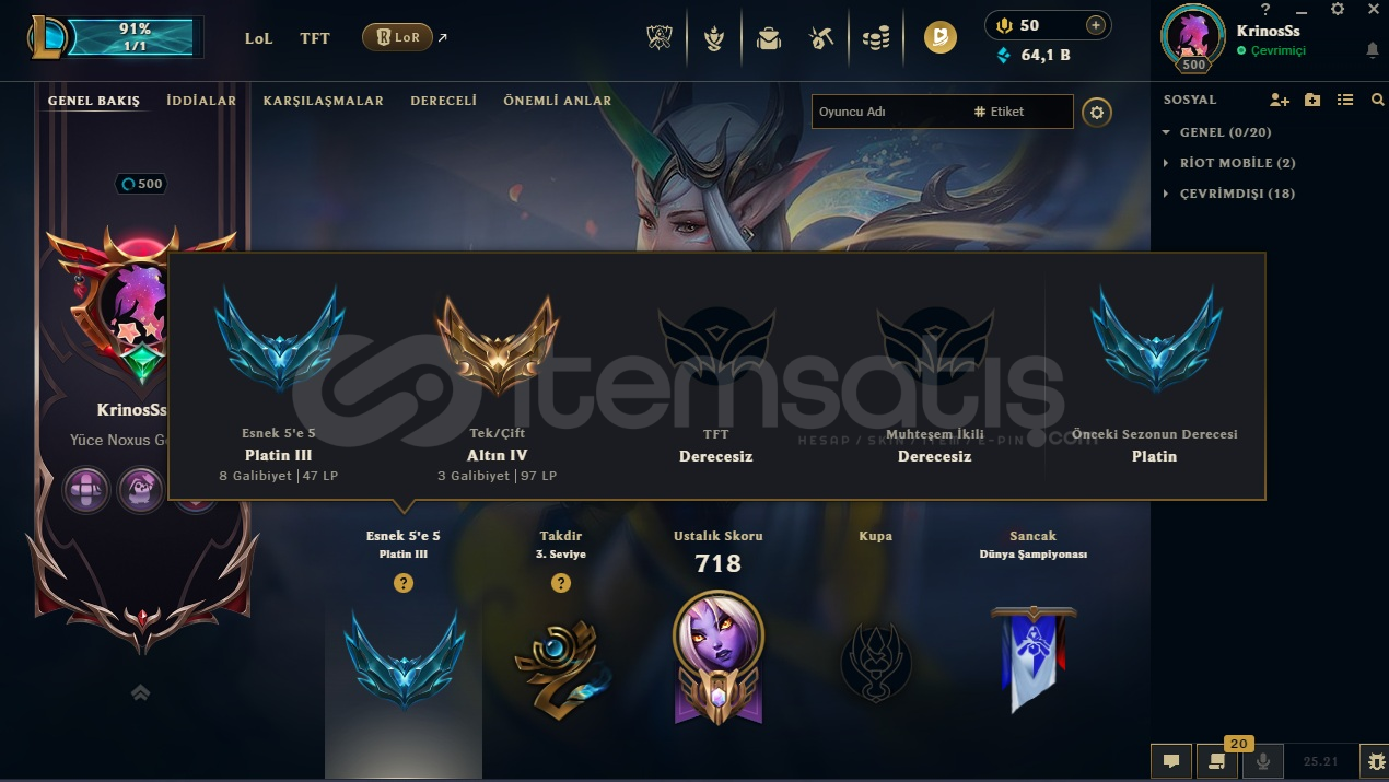 Selamlar;Öncelikle benim sadece 'LoL' hesabı değil, riot hesabı sattığımı anlamanızı istiyorum, burada olduğu kadar Valorantta da bir şeyler var.Bu hesap benim göz ağrım, 2015'ten beri aktif bir şekilde oynanmış bir hesap. Artık oynamadığımdan kenarda boş durmasını istemiyorum ve en azından kullanacak birisine gitmesini istiyorum. Satın almadan önce kesinlik...