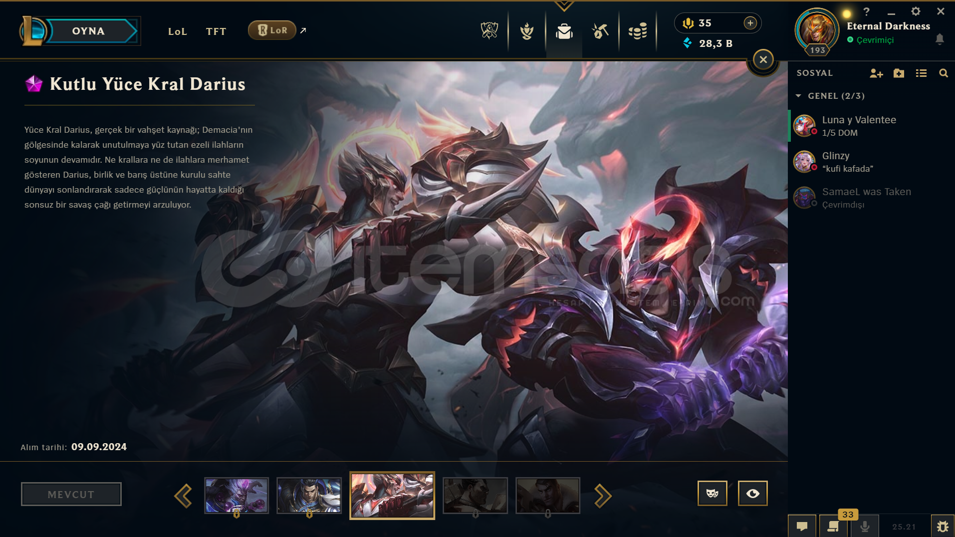 Hesapta 8K'lık Darius skini bulunmaktadır.Hesapta 180 adet Skin bulunmaktadır.Hesap 193 Seviyedir.