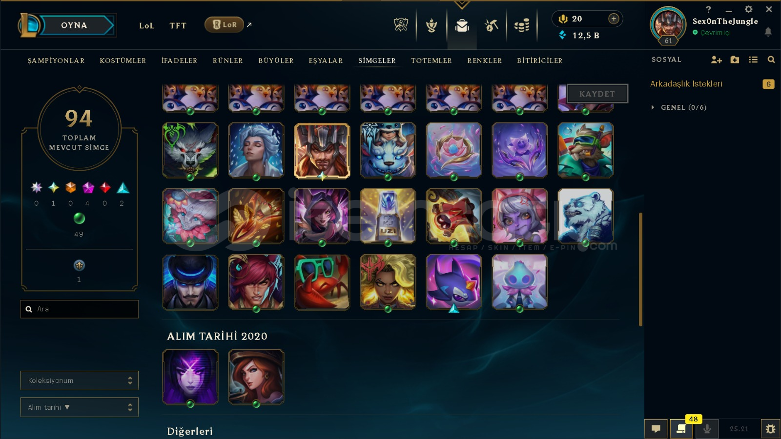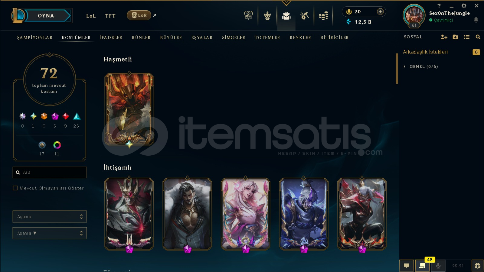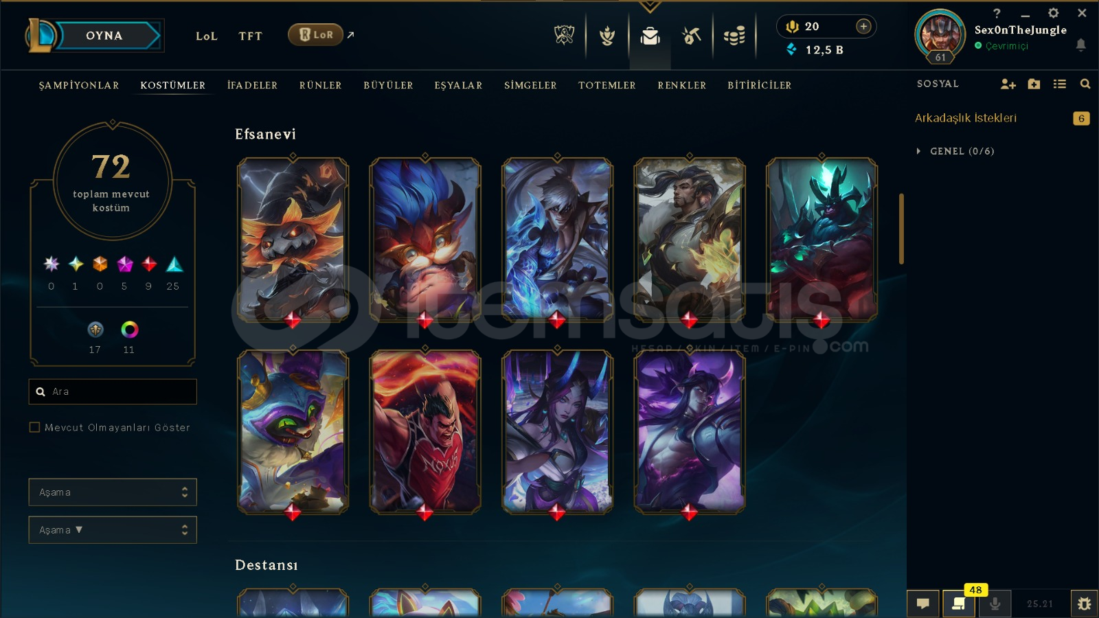 BİR ÇOK SKİN BULUNAN 2020 YILINDA BENİM AÇTIĞIM 3800 TL KADAR PARA YATIRIRMIS HİÇ BAN YEMEMİŞ KALİTELİ BİR JUNGLE MAİN FAKAT DİĞER LANELERDE DE BOLCA KOSTÜM VE HERO BULUNMAKTA