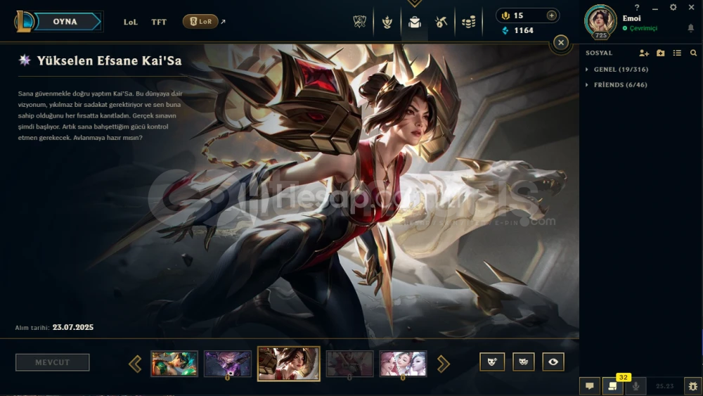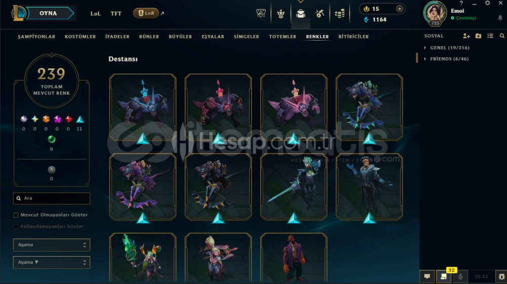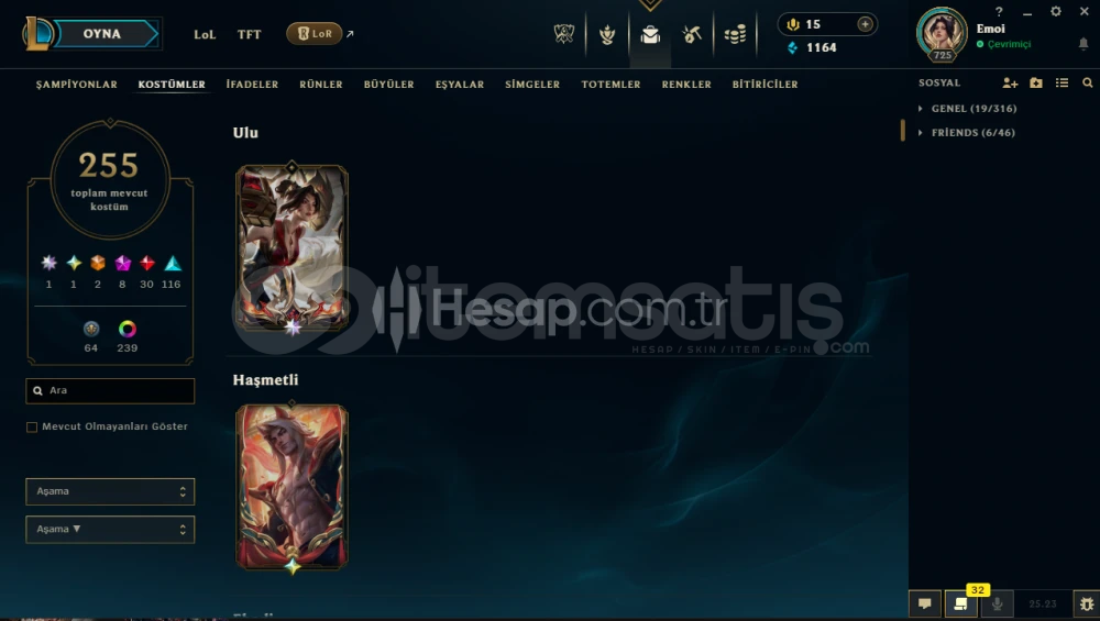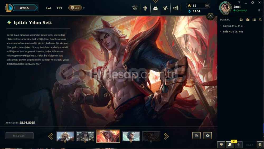 hesapta(yükselen efsane kaisa + ışltılı yılan sett) ile 2 ebedi, 8 ihtişamlı, 30 efsanevi, 116 destansı,64 hatıra ve 239 renk beraberinde toplamda 255 adet kostüm bulunmaktadır. yanında içerisinde champions 2022 seti, 2-3 battle pass ve 2 adet vandal deseni bulunan valorant hesabı da bulunmakta. Hesabı gerekli nedenlerden dolayı hesabımı satmaktayım.