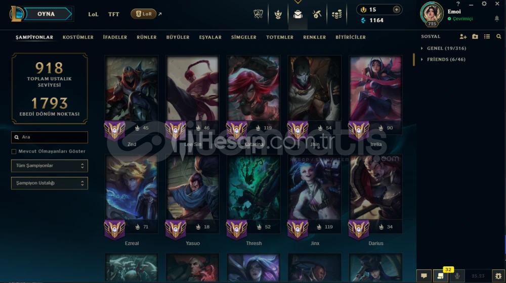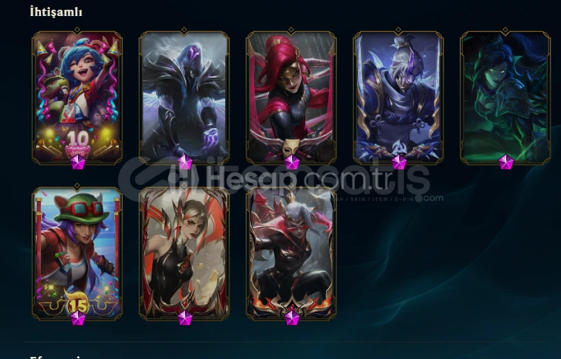 hesapta(yükselen efsane kaisa + ışltılı yılan sett) ile 2 ebedi, 8 ihtişamlı, 30 efsanevi, 116 destansı,64 hatıra ve 239 renk beraberinde toplamda 255 adet kostüm bulunmaktadır. yanında içerisinde champions 2022 seti, 2-3 battle pass ve 2 adet vandal deseni bulunan valorant hesabı da bulunmakta. Hesabı gerekli nedenlerden dolayı hesabımı satmaktayım.ilgilenenler iletişime geçerse sev...