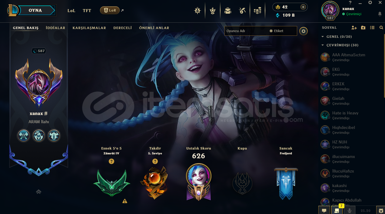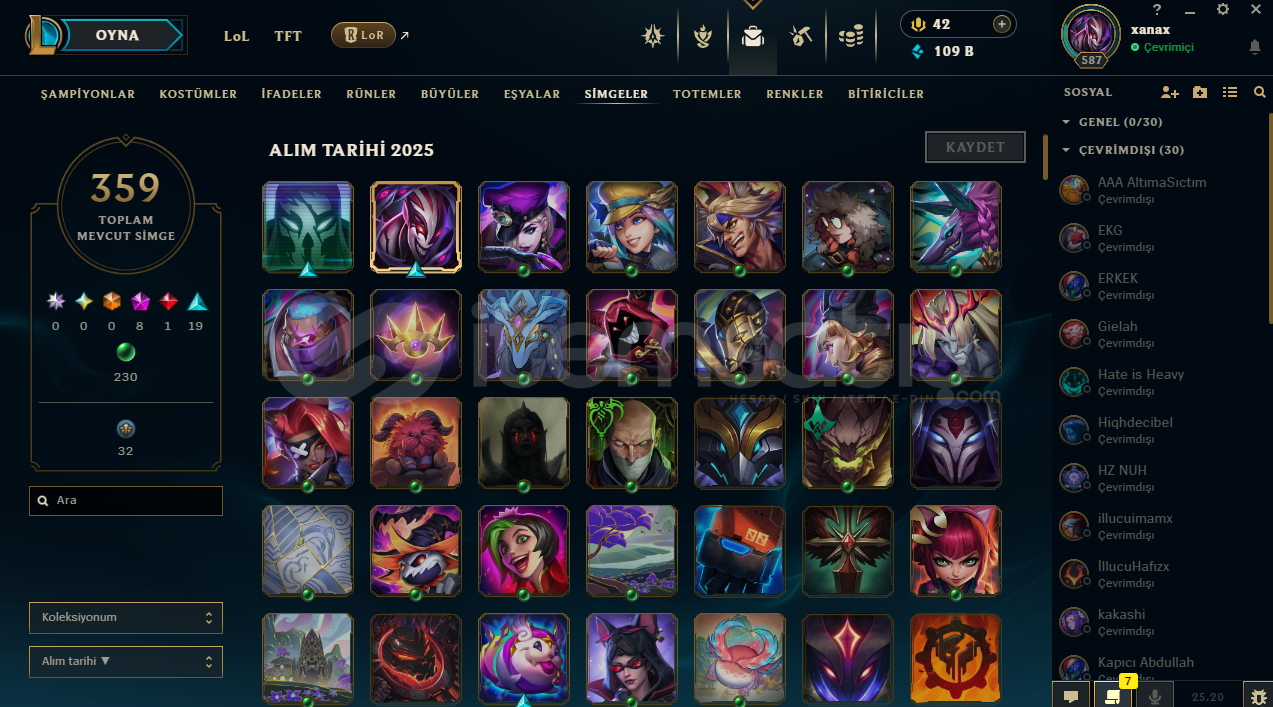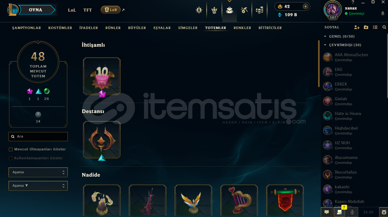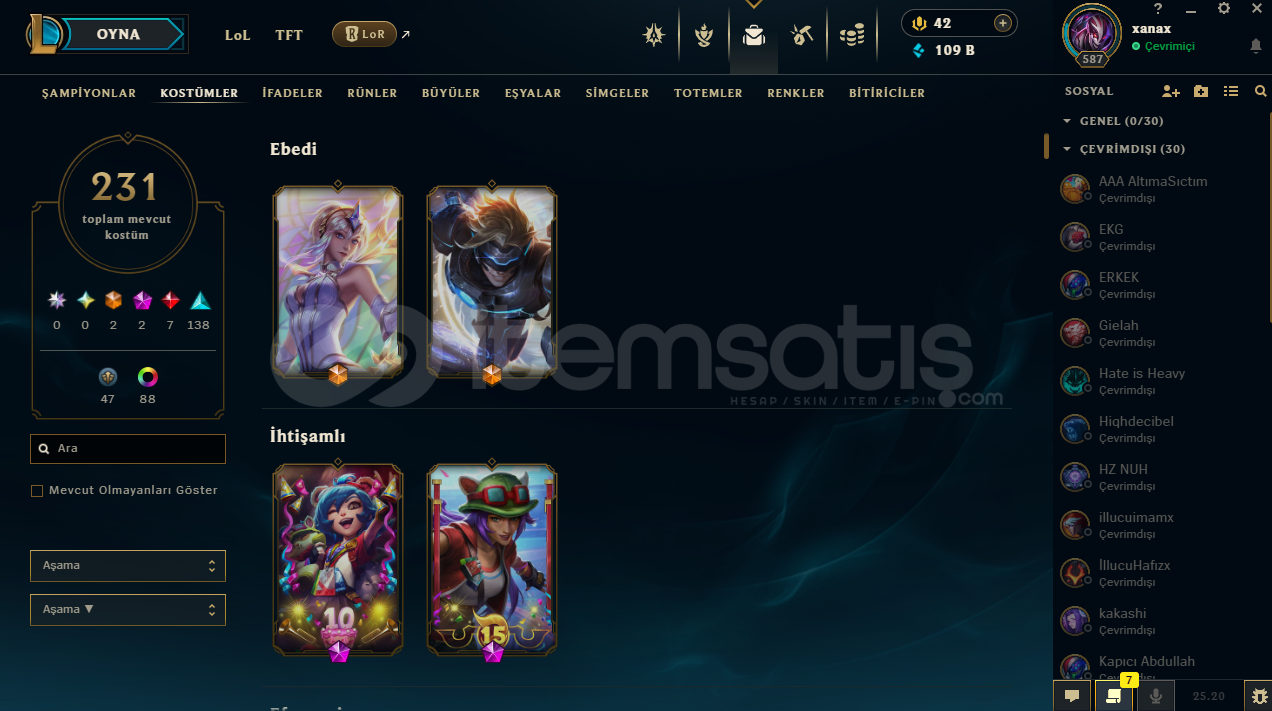 FULL CHAMP231 KOSTÜM359 SİMGE48 TOTEM GÖR.88 KOSTÜM RENK295 İFADE109K MAVİ ÖZHERKESE İYİ OYUNLAR DİLERİM...