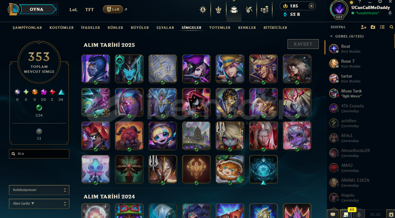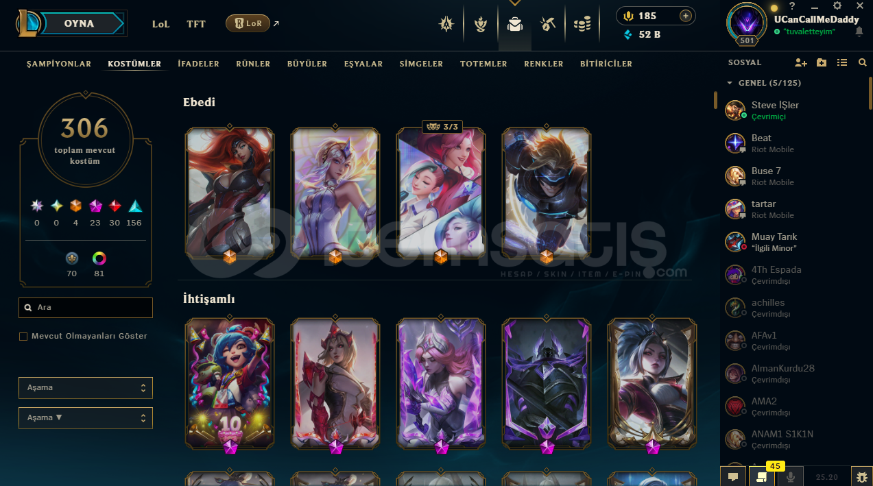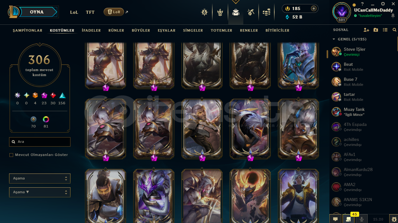 FULL CHAMP306 KOSTÜM353 SİMGE54 TOTEM GÖR.81 KOSTÜM RENK355 İFADE52K MAVİ ÖZHERKESE İYİ OYUNLAR DİLERİM...