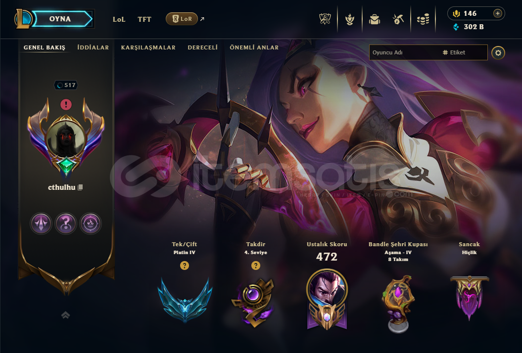 • Plat 4 lig seviyesi ve geniş kostüm/şampiyon portföyü ile hem koleksiyon hem oyun keyfi için ideal.