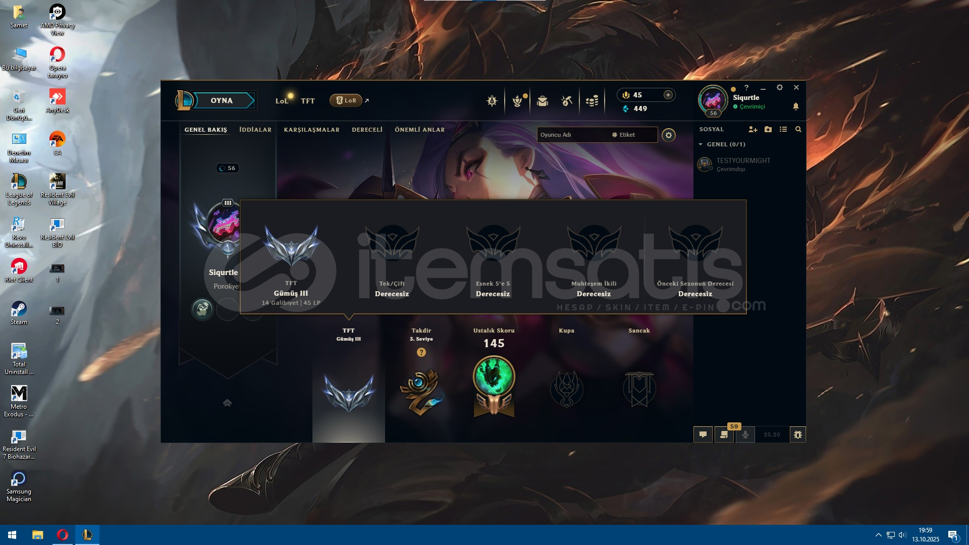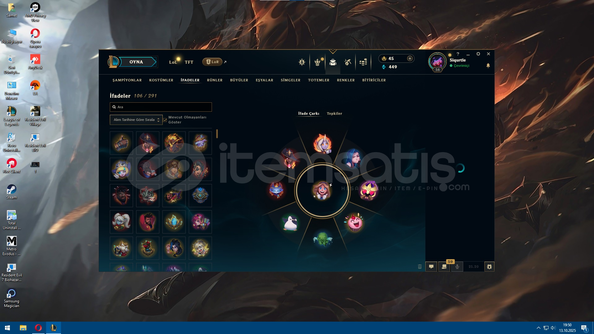 Merhabalar emek hesabımdır ellerimle zaman buldukça oynadığım hesabımdır56 lvldir4 tane efsanevi skin var ( savaş kraliçesi katarina ) mevcuttur hastasına tüm bilgileri teslim edilecek mail adresi değişimi yapılacak106 emoji vardır hiç bir ceza almadı taktir seviye 3 dür3 iade hakkı duruyor73 ŞAMPİYON varsaygılar...