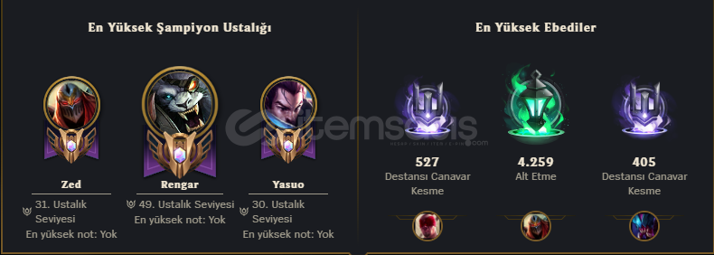 Merhaba, Sezon 4 den beri aktif olarak kullandığım bir hesaptır. Artık LoL oynamaktan keyif almadığım için satmak istiyorum. Elosu genellikle Diamond ve Master arası gidip gelmektedir. Bugüne kadar hesap hiçbir şekilde ban yemedi ve söz konusu değildir. Satın almanız durumunda TFT hesabıda otomatikmen sizln olacaktır. Hesapta 53bin mavi öz 223 kostum ve bütün şampiyonlar bulunma...