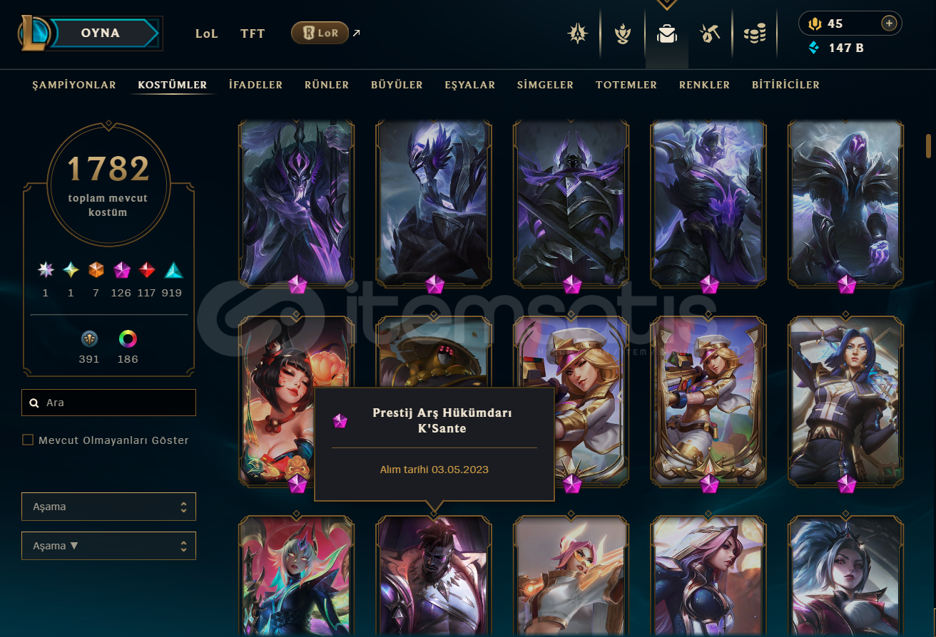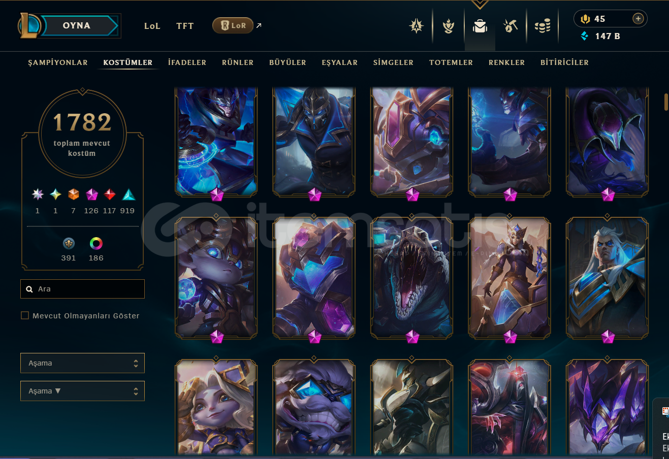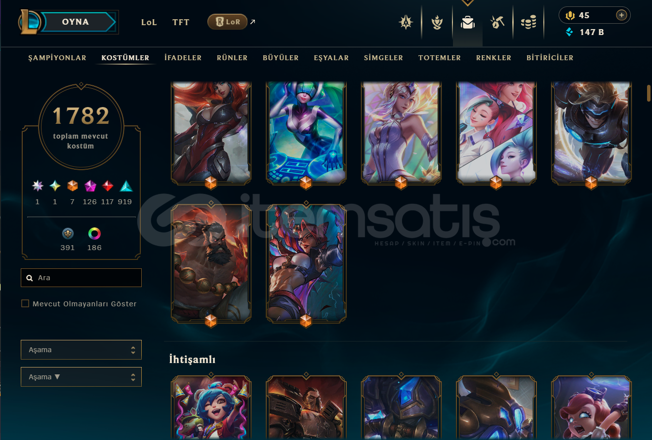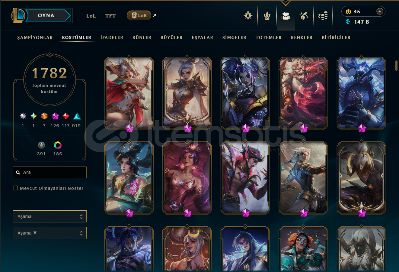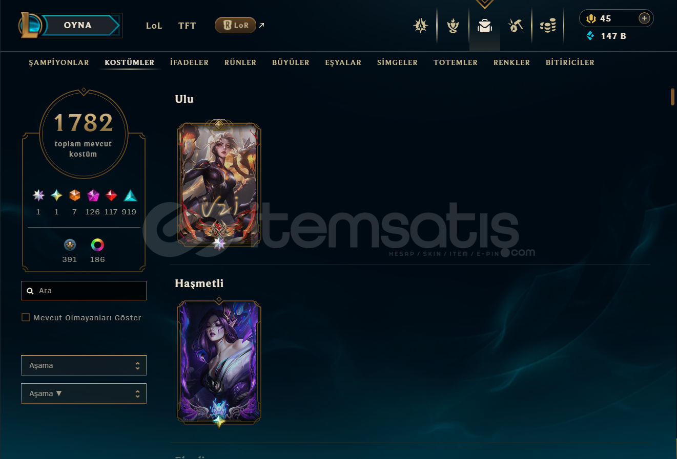1 Ulu Kostüm(Kai'sa) . 1 Işıltılı Kostüm(Morgana) . 7 Ebedi Kostüm . 126 İhtişamlı Kostüm . 117 Efsanevi Kostüm . 919 Destansı Kostüm vardır.