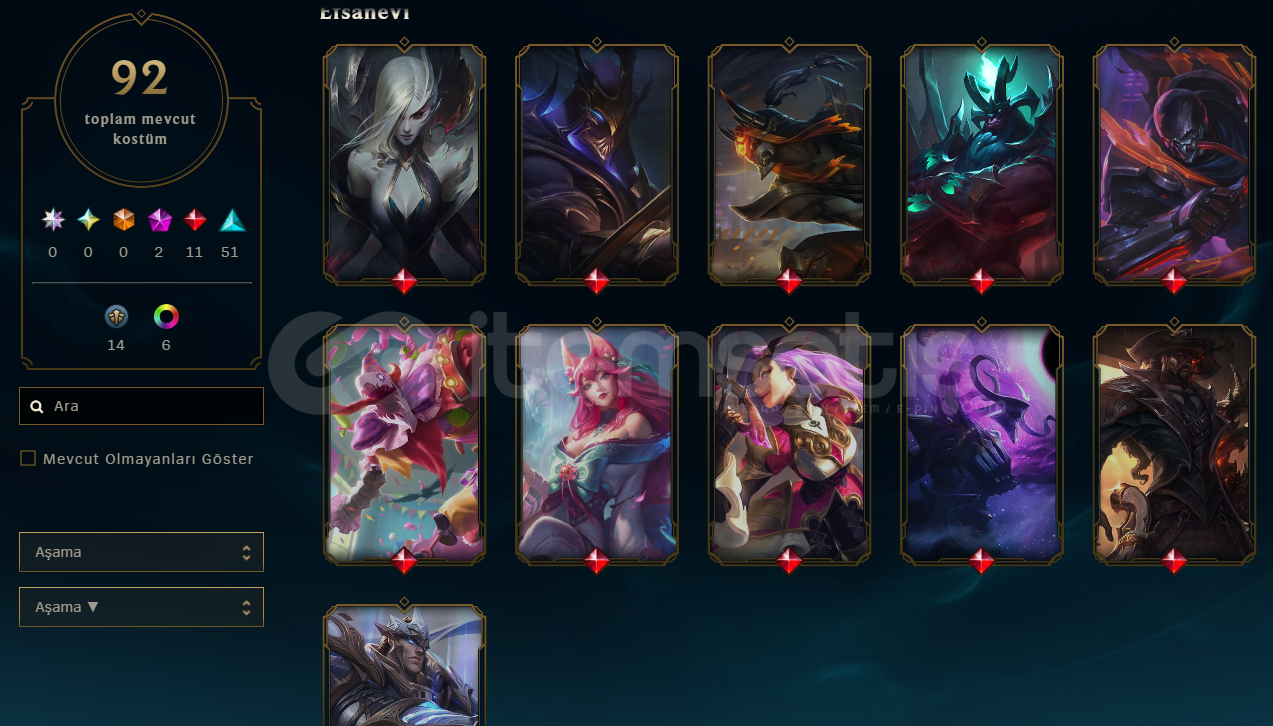 2 İhtişamlı11 Efsanevi51 Destansı114 HatıraKostüm Bulunmaktadır 310 Level Elo Hell değildir!!!!!!Katarina Maindir 4 adet kostümü bulunmaktadır (Prestij Periler Meclisi / Savaş Kraliçesi (2 adet rengi bulunmakta) Ölüm elçisi / Kar Katili)Gelen LP 35+!!!!!!Alınmamış son 8 karakter kalmıştır onun dışındaki tüm karakterler alınmıştırBugüne Ka...