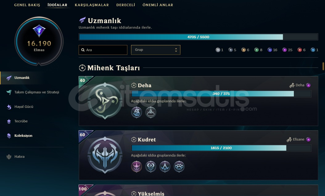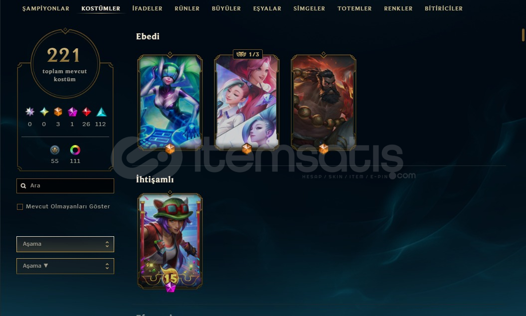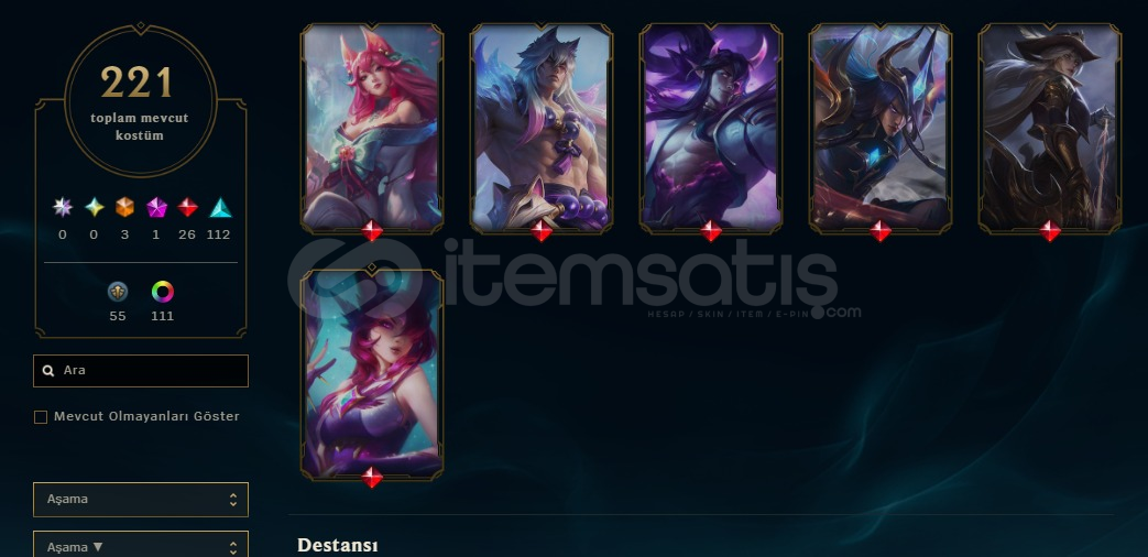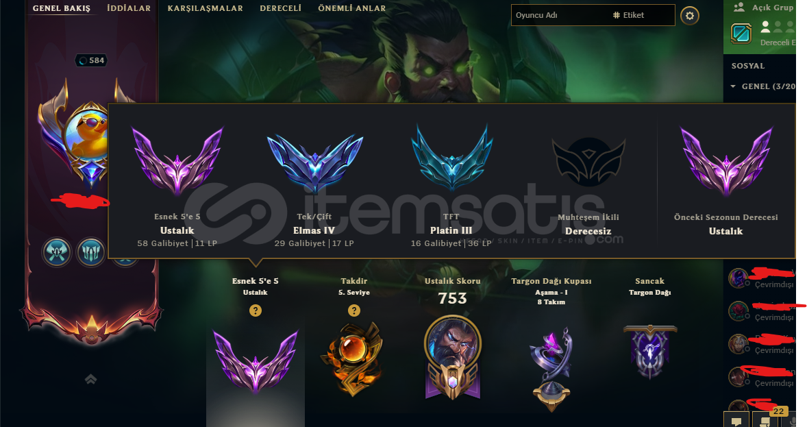 Hesap daha önce Ustalık ligine çıktı. TFT’de de Ustalık ligine çıktı. Hiç ban yememiş tertemiz bir hesap. İsim değişikliği mevcut durumda ve arkadaş listesinde yaklaşık 20 kişi var, silmeyle uğraşmazsınız. İsteyene tüm kostüm ve içeriklerin fotoğraflarını atabilirim.