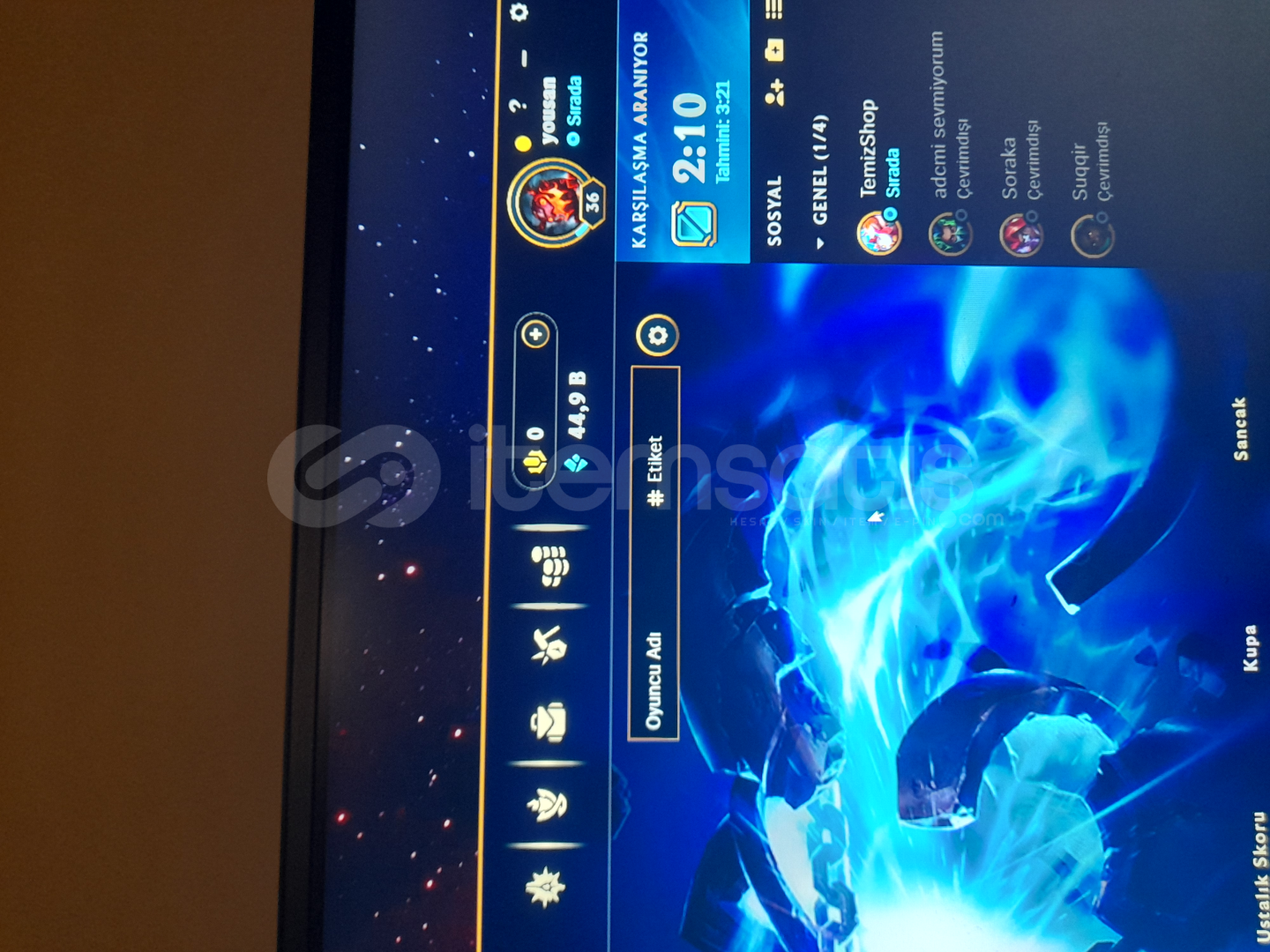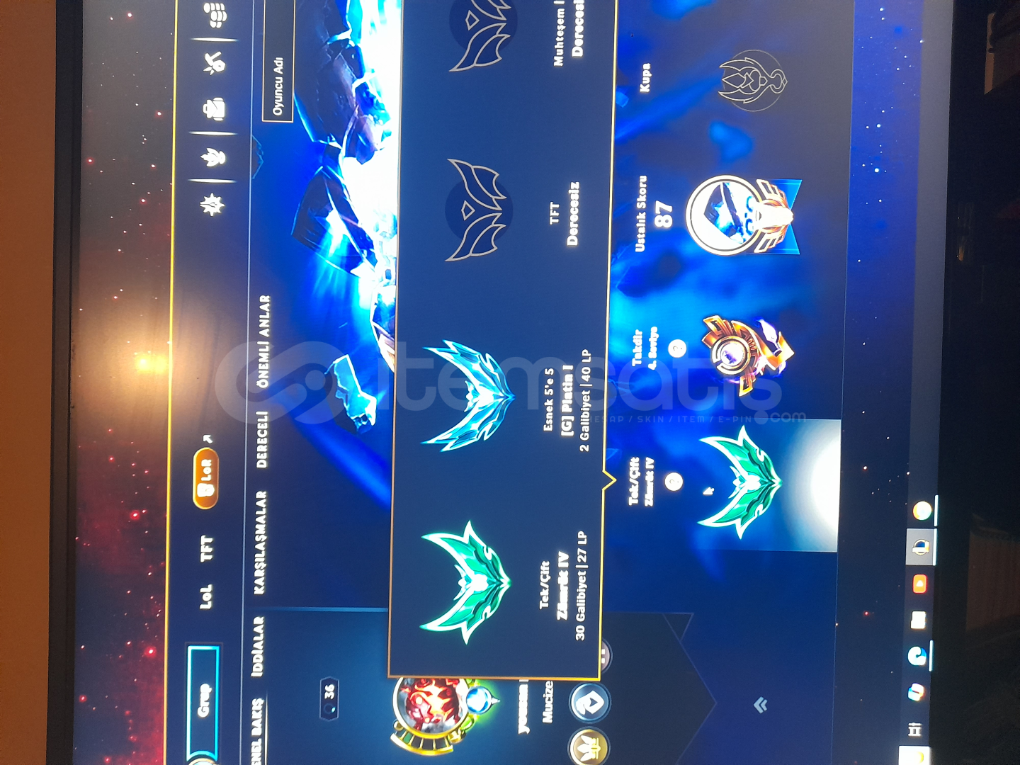 36 lvl Elle kasılmıştır mmr yüksek hesapzümrüt 4 57lp . 30 lp geliyor 12 gidiyor esnek 2 maç atıldı 2 side win plat 1 40 lp 21 şampiyon açık çantada 17 tane ucuzdan alabileceğiniz şampiyon var 5 tane kutudan çıkmış kostüm var 10 ihtişamlı öz var 4 seviye takdir 45 k öz var açık kostüm yoktur