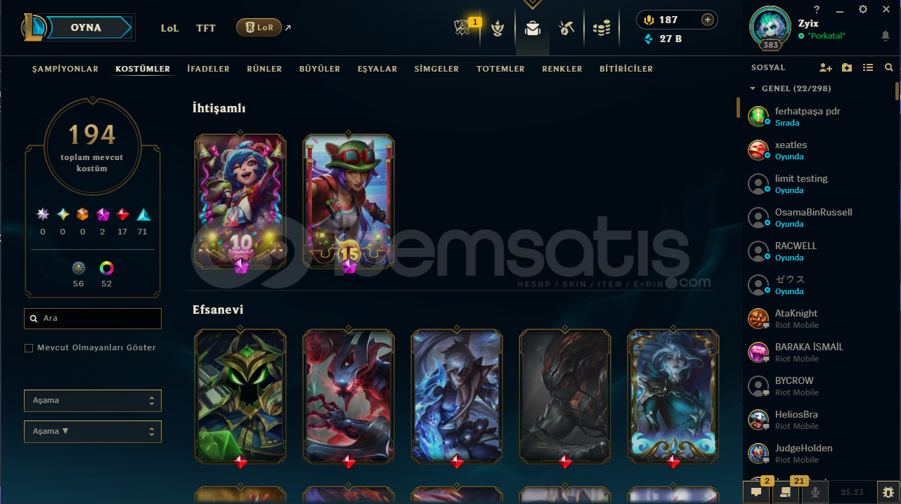 Lol hesabı 194 adet skini var 384 level tüm çarlar açık şu anda zümrüt 4 herhangi bir banı yok paraya sıkışık olduğum için bu fiyata satıyorum Cumaya kadar bu fiyat