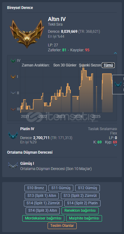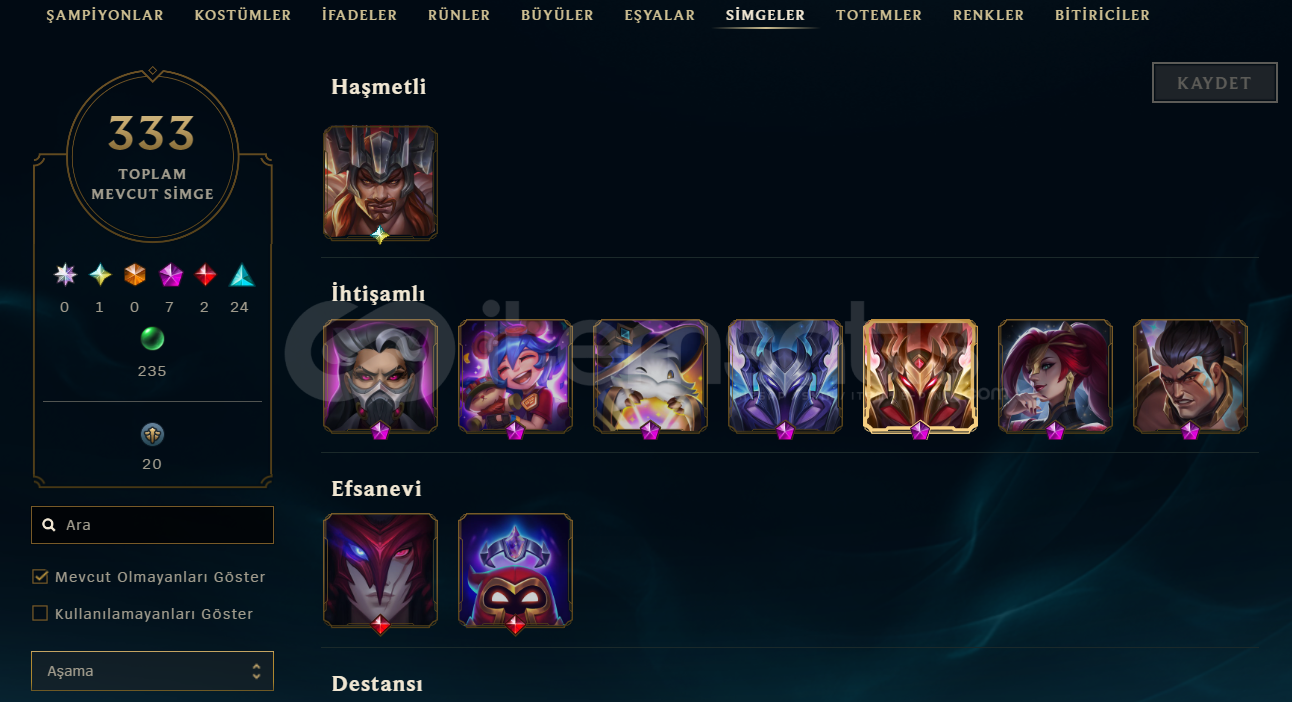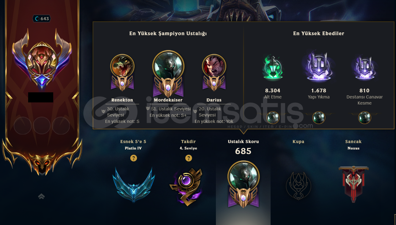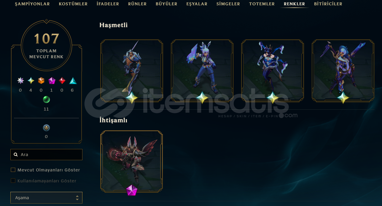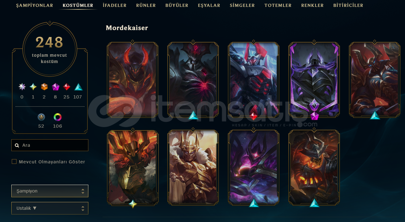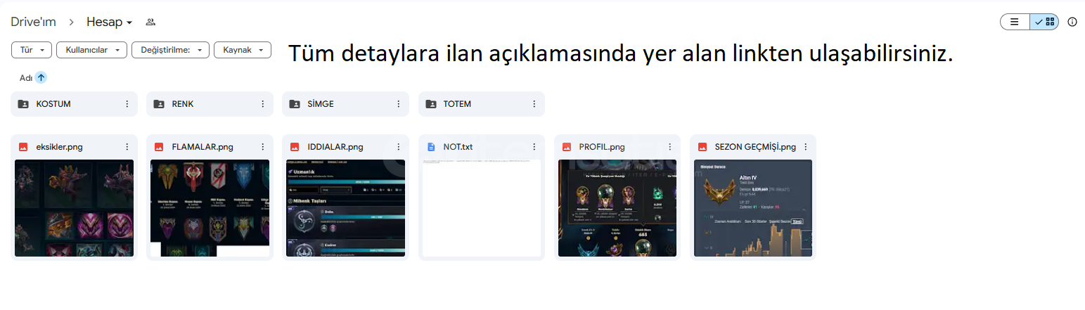 Sahn-ı Uzal Mordekaiser, Kül Mezar Şövalyesi Mordekaiser,Annie Emo, Hextech RenektonAyrıca 2 ebedi kostüm ve bir daha gelmeyecek ender kostümler mevcuttur.643 Seviye248 Kostüm333 SimgeEsnek PLAT 4Tek çift ALTIN 2107 Renk paketi54 Totem303 İfadeTakdir Seviyesi 4Hesaba ait tüm görseller ve aklınıza takılan sorular, aşağıda bulunan Drive linkinde detaylı bir şekilde klasörlenmiştir : http...