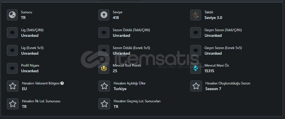 oynamadıgım için satılıktır. elosu dia 1 civarı olması lazım en son oynadığım da öyleydi. yeni gelen şampiyonlar hariç hepsi açık. ilk mail onayı yapılmadı yeni maili var onunla birlikte verilecektir isteyen kişi o maili kullanır isterse de kendi mailine devir yapılabilir.