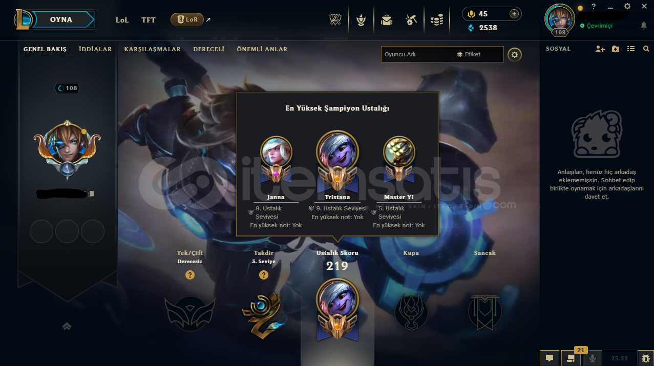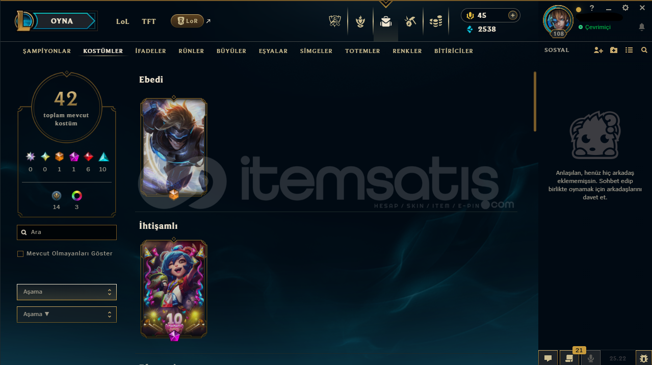 Hesabın E-Posta'sı ve Tüm bilgileri değiştirilebilir.Teslimatlar Otomatik Yapılmaktadır, 7/24 satın alır almaz tüm hesap bilgilerine ulaşabilirsiniz...Dereceli Direkt Girilebilir.2538 Mavi Öz & 826 Turuncu Öz + 10 Anahtar Bulunmaktadır.Hesabınızı satın aldıktan sonra sizden başka kimsenin erişimi olmaz.108 Level - UNRANKED(TR) Hesaptır.42 Kostüm ve 73 Şampiyon bu...