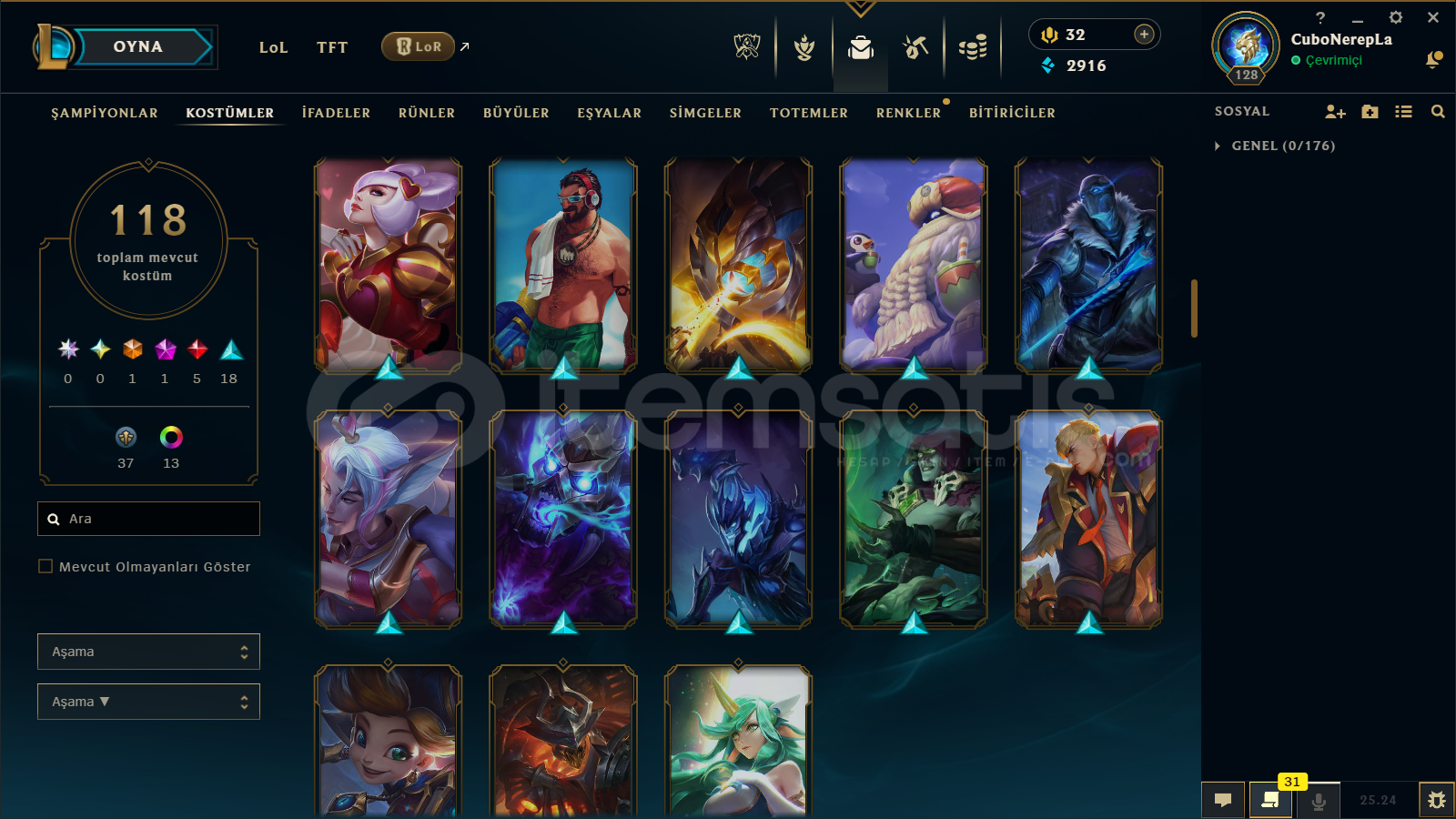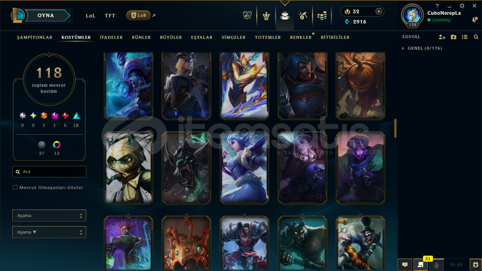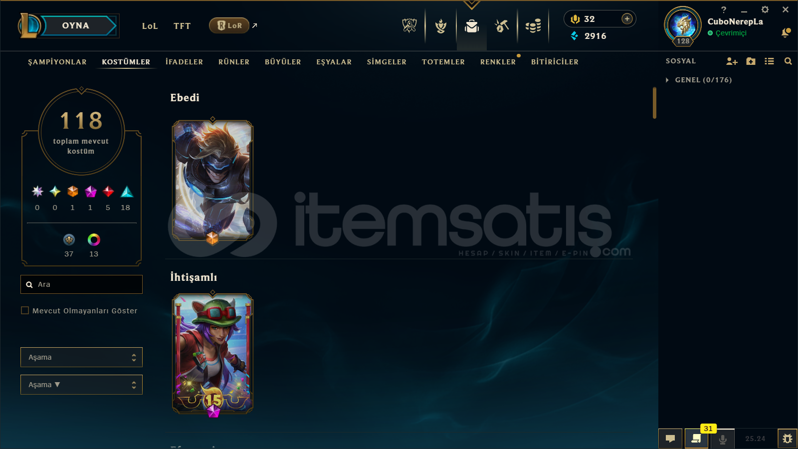 🔷 League of Legends Bilgileri🔹 Sunucu: TR🔹 Level: 128🔹 Sıralama:• Tek/Çift: Altın 1• Esnek 5v5: Altın 4🔹 Mavi Öz: 2916🔹 Şampiyon Sayısı : 134🔹 Kostüm Sayısı: 118📊 OP.GG Profili : https://op.gg/tr/lol/summoners/TR/CuboNerepLa-TR1✅ Hesaplarımın Tamamen ArkasındayımPiyas...