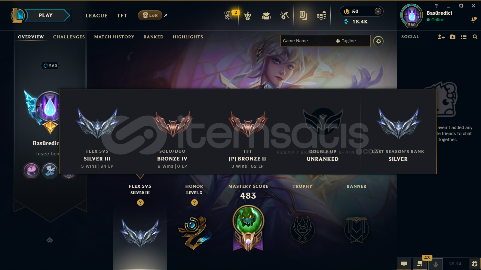 🔷 League of Legends Bilgileri🔹 Sunucu: TR🔹 Level: 260🔹 Sıralama:• Tek/Çift: Bronz 4• Esnek 5v5: Gümüş 3🔹 Mavi Öz: 18400🔹 Şampiyon Sayısı : 170🔹 Kostüm Sayısı: 130📊 OP.GG Profili : https://op.gg/tr/lol/summoners/TR/Bas%C3%BCredici-tr31✅ Hesaplarımın Tamamen ArkasındayımPiya...