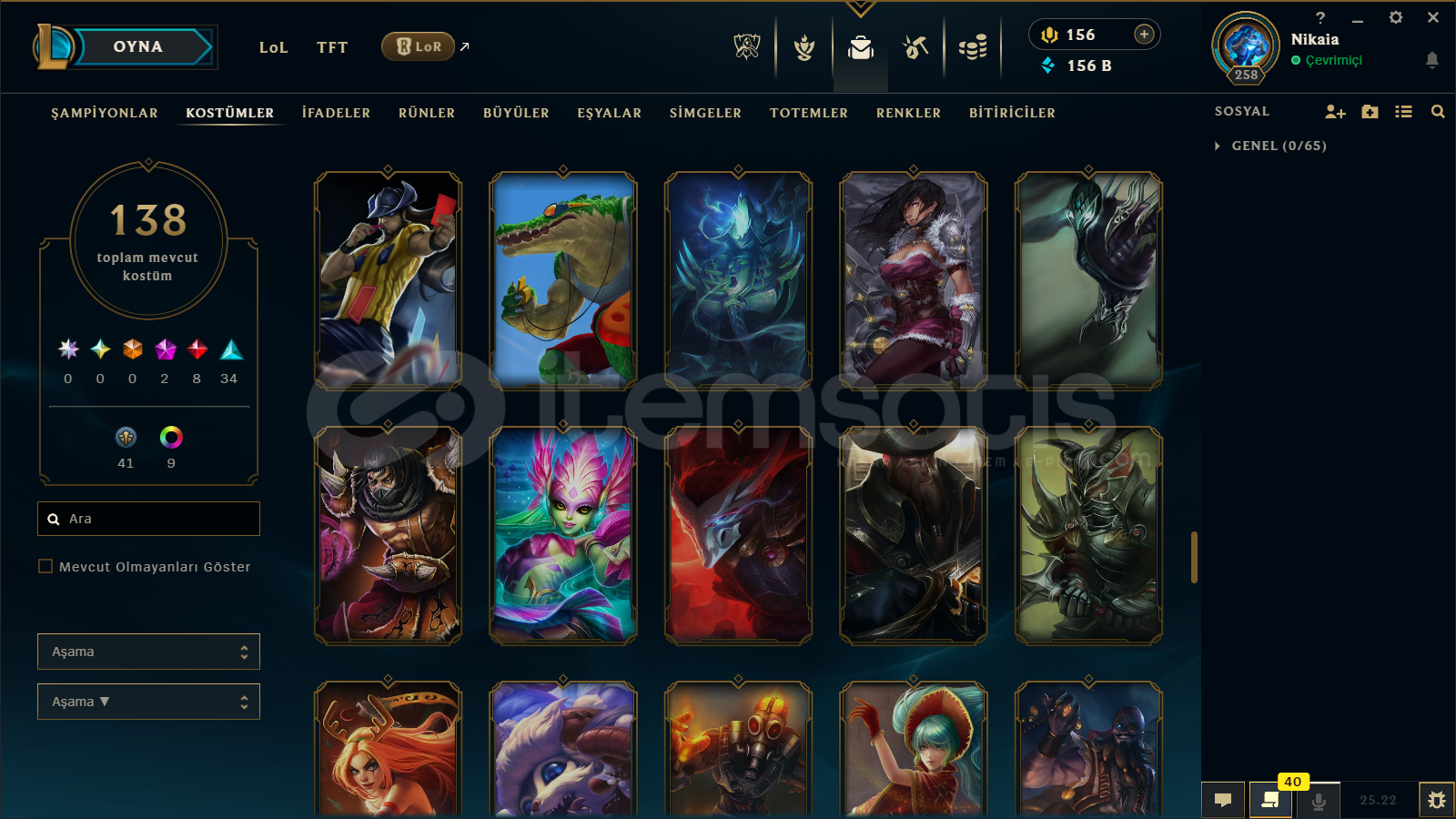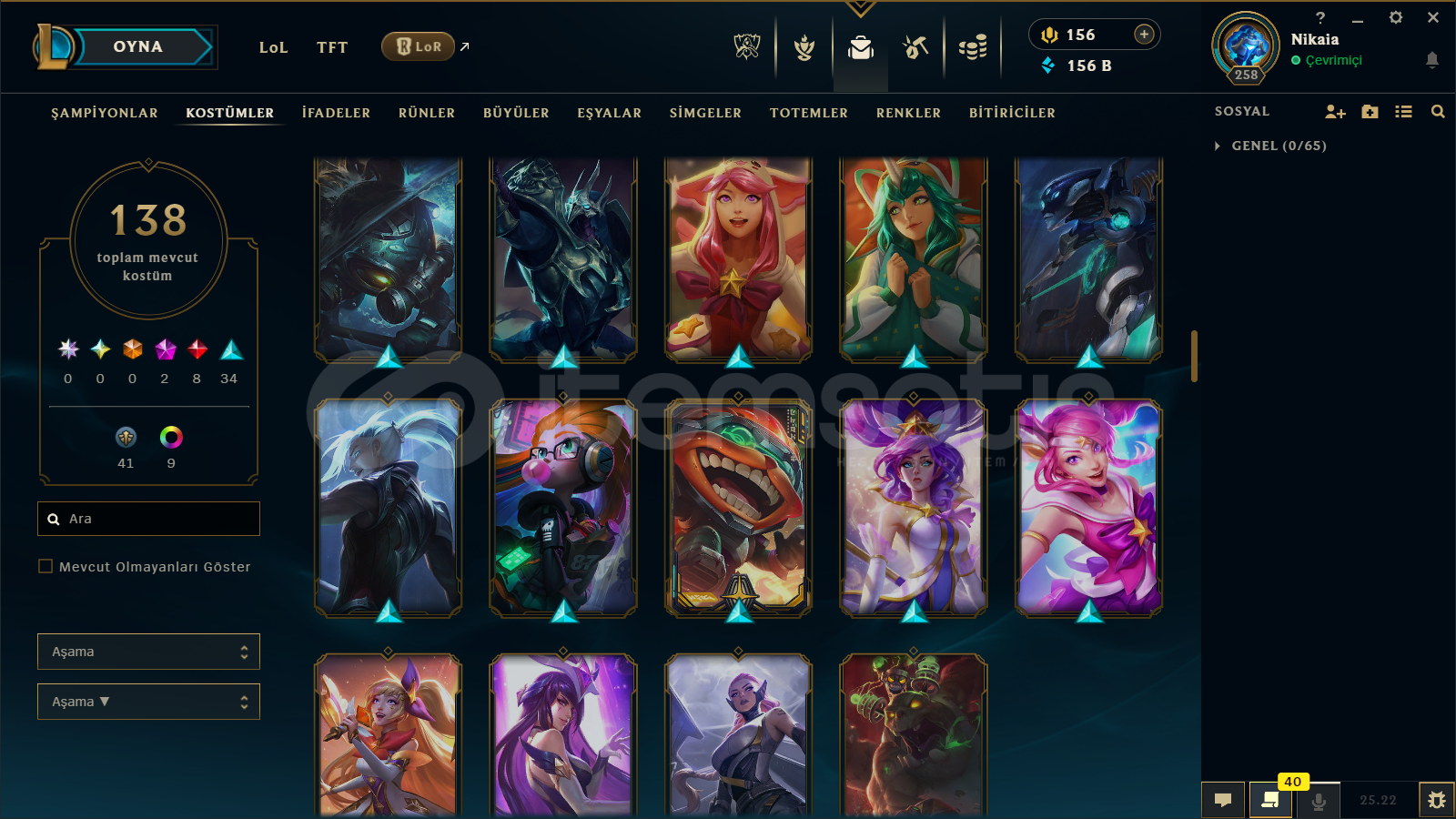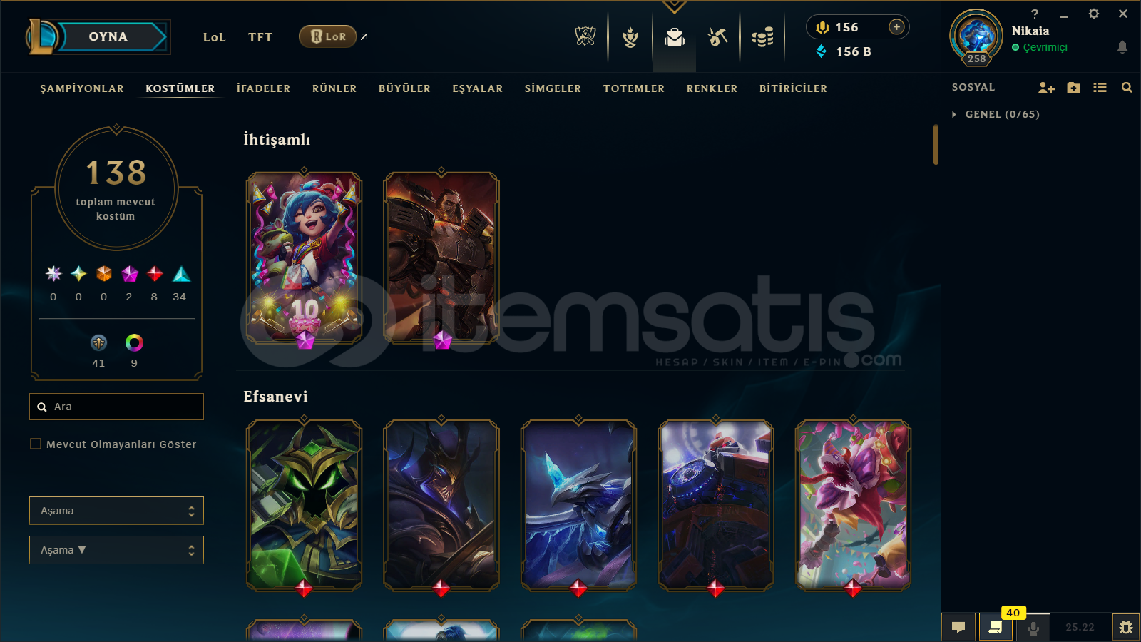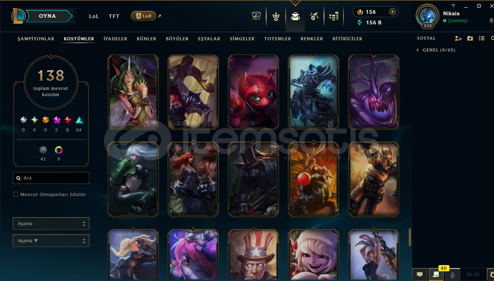 🔷 League of Legends Bilgileri🔹 Sunucu: TR🔹 Level: 258🔹 Sıralama:• Tek/Çift: Unranked• Esnek 5v5:Unranked🔹 Mavi Öz: 156 Bin🔹 Şampiyonlar: Hepsi açık🔹 Kostüm Sayısı: 138📊 OP.GG Profili : https://op.gg/tr/lol/summoners/TR/Nikaia-TR1