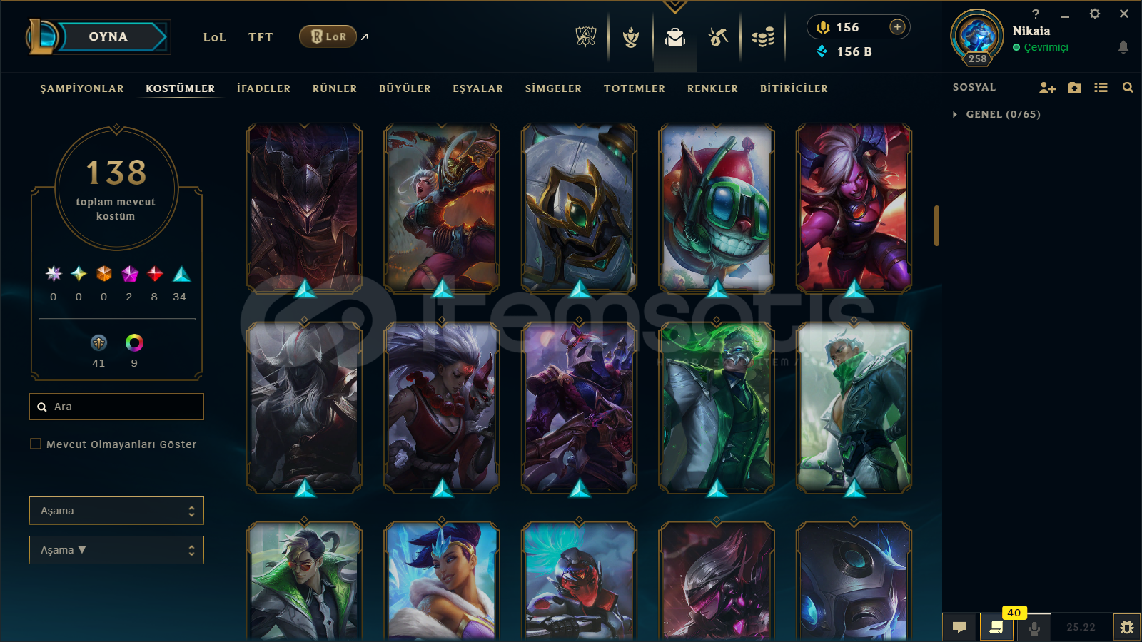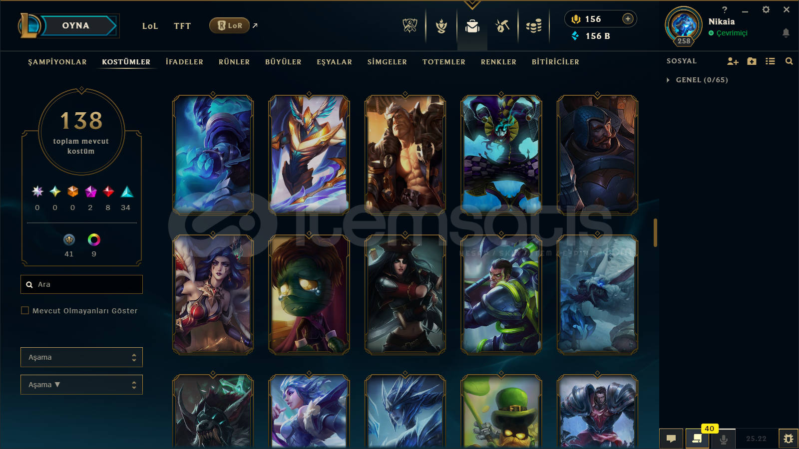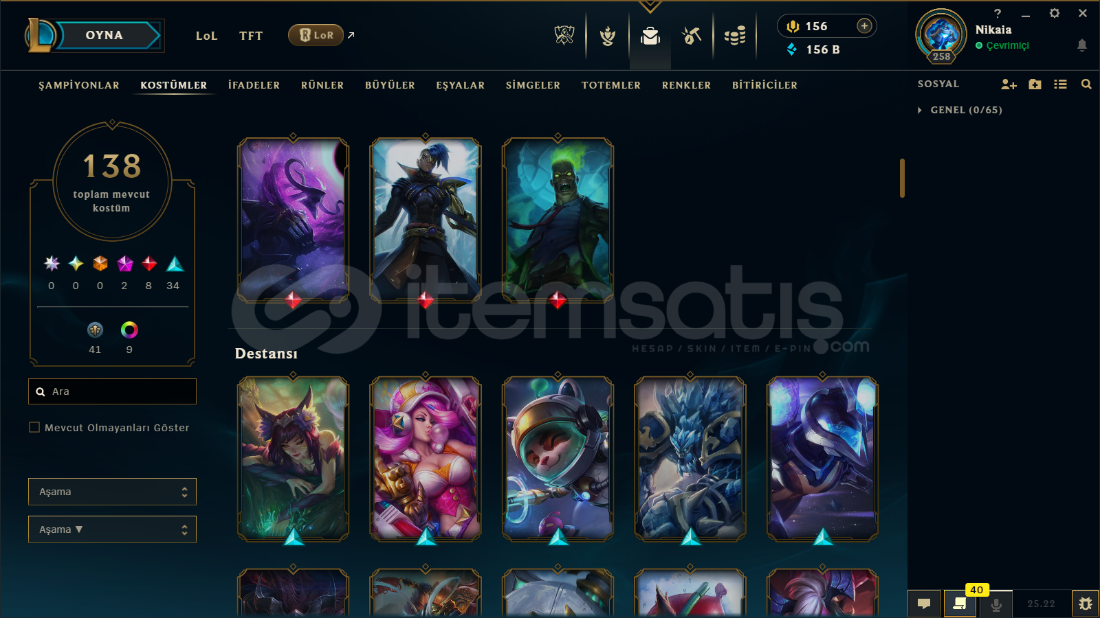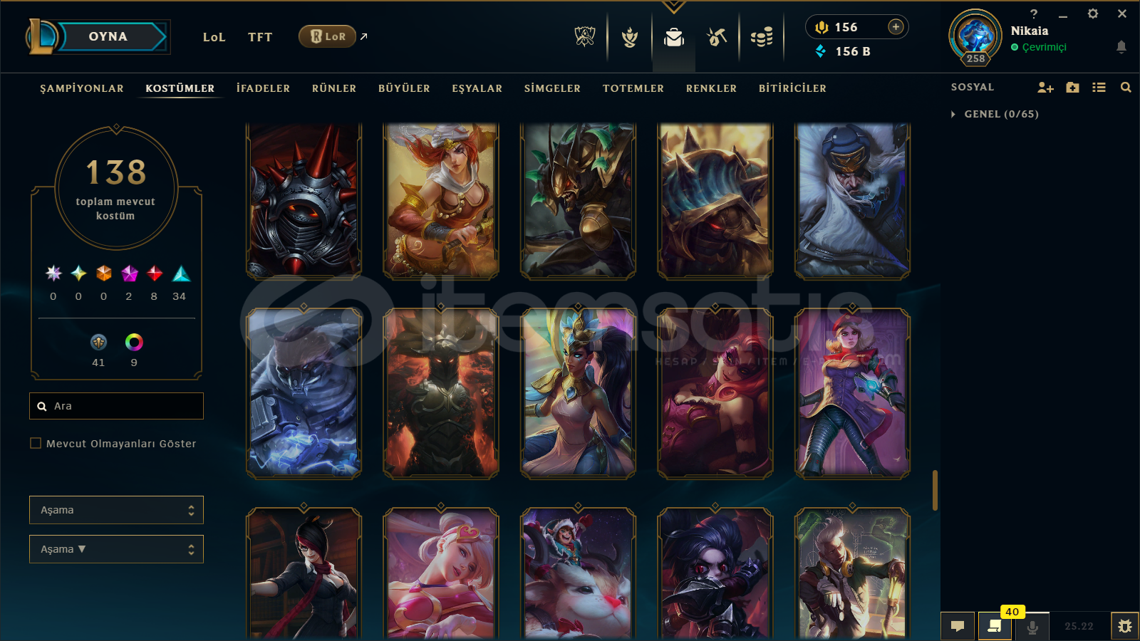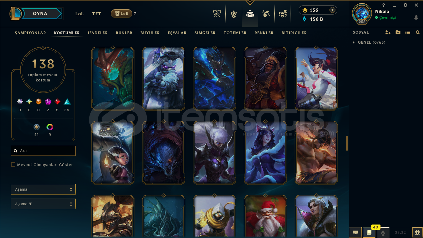 🔷 League of Legends Bilgileri🔹 Sunucu: TR🔹 Level: 258🔹 Sıralama:• Tek/Çift: Unranked• Esnek 5v5:Unranked🔹 Mavi Öz: 156 Bin🔹 Şampiyonlar: Hepsi açık🔹 Kostüm Sayısı: 138📊 OP.GG Profili : https://op.gg/tr/lol/summoners/TR/Nikaia-TR1