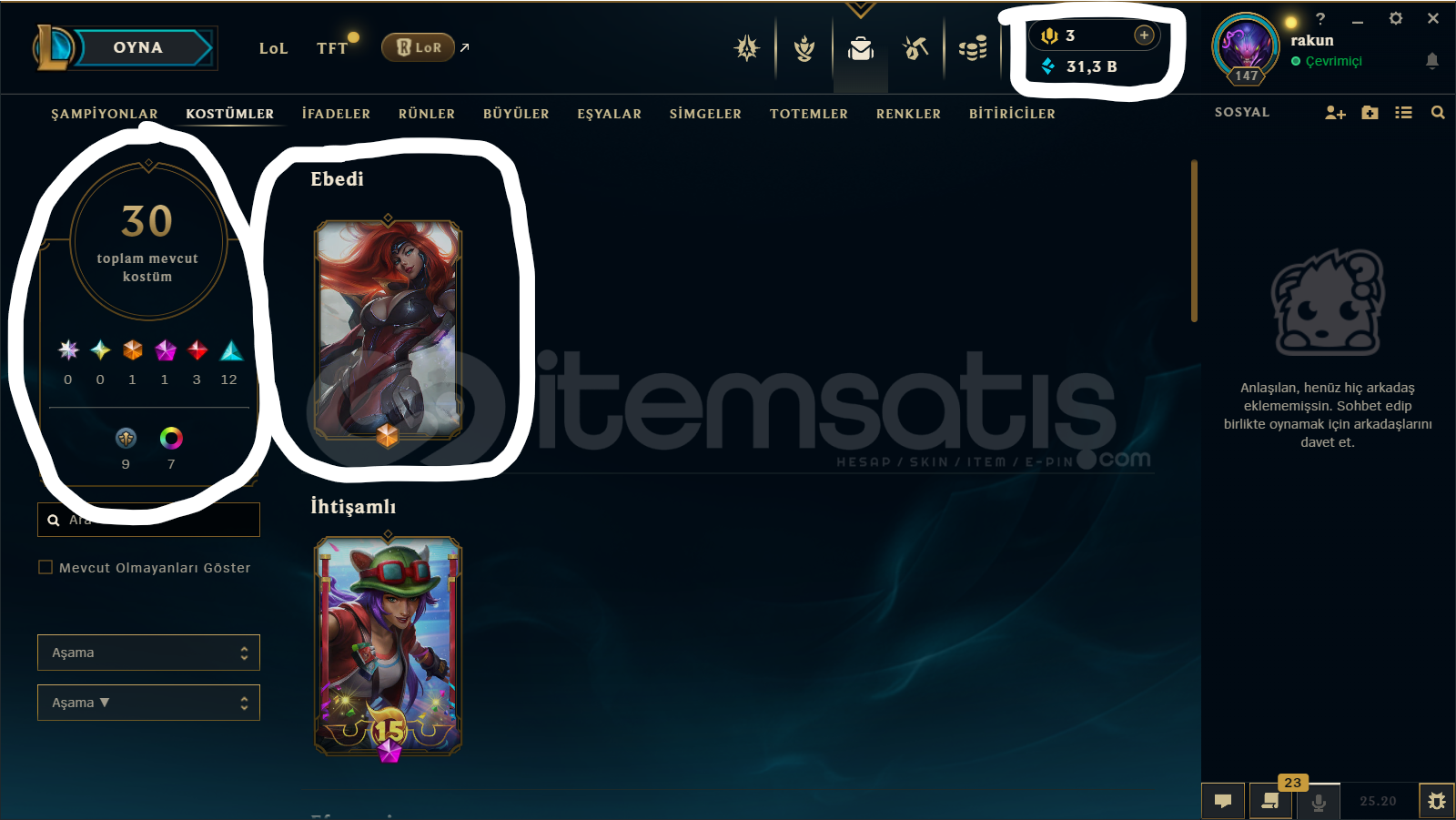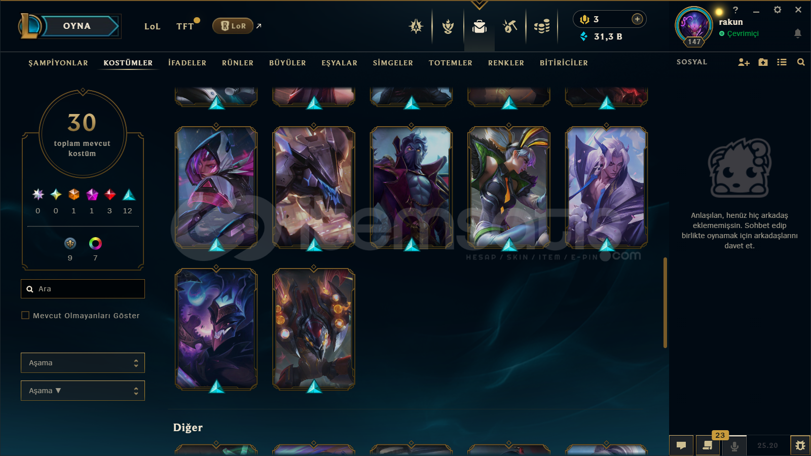 Aktif olmasam bile otomatik teslimat yapılmaktadır.En hızlı ve güvenilir alışveriş yapabileceğiniz mağazaya hoşgeldiniz :+4500 Başarılı satış güvencesiyle..MAİL : KENDİ MAİLİNİZE DEVREDİLECEKRANK : TEK ÇİFT BRONZ I / ESNEK G- BRONZ IIIHERO : 117SKIN : 30SİMGE SAYISI : 89MAVİ ÖZ : 31,3 B /&nbs...
