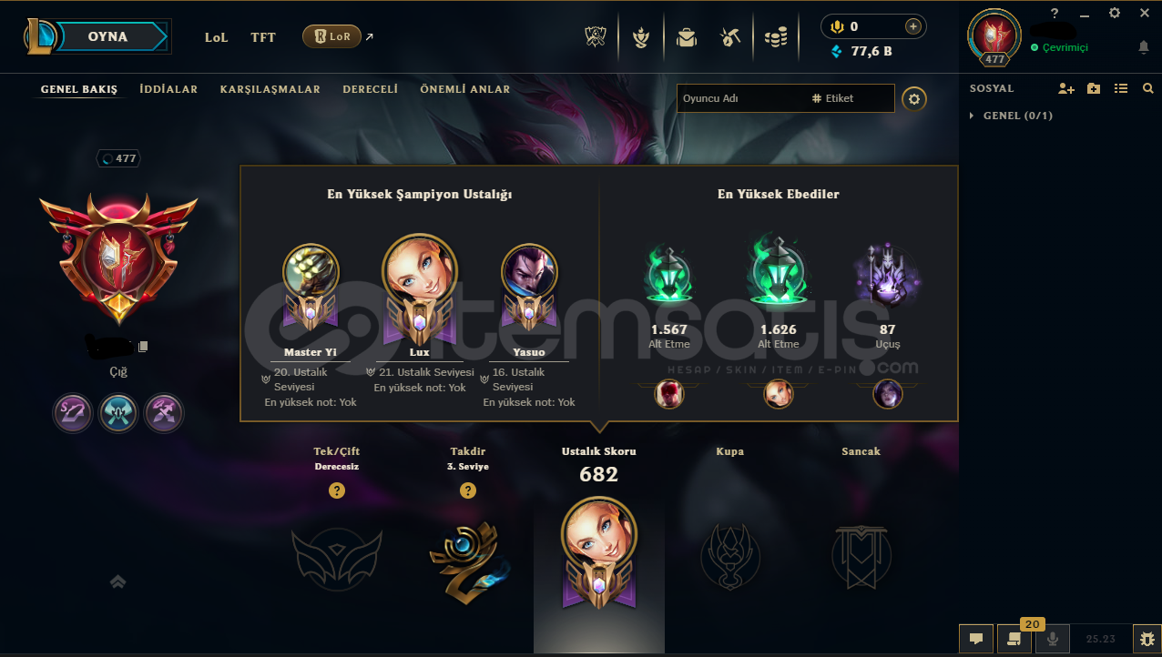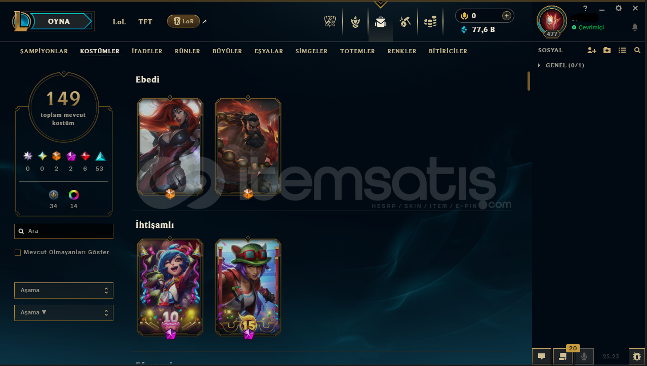 ⭐TR+149SKIN+477LVL+VALO~ 1,775+171CHAR+77K ÖZ⭐