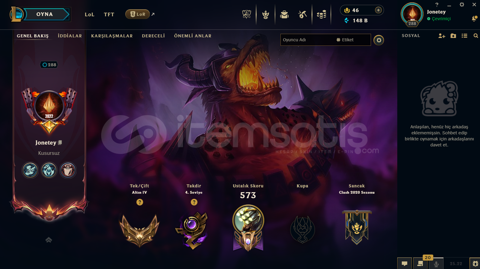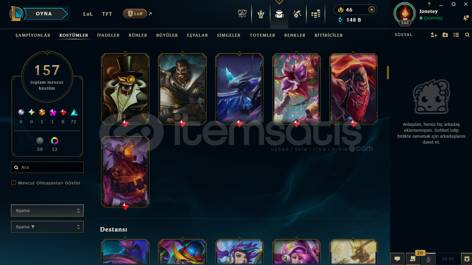 SUNUCU:TRRANK:GOLD IVLEVEL:288TOPLAM LOLDE:157 SKİN1 EBEDİ1 İHTİŞAMLI6 EFSANEVİ72 DESTANSI39 HATIRA13 RENK PAKETİTOPLAM AÇIK ŞAMPİYONLAR:FULLHAZIR KUTU:8SATIN ALINDIKTAN SONRA MAİL VE ŞİFRE DEĞİŞİMİ TARAFINIZA YAPILACAKTIR.🧨 Ürün AçıklamasıErişim ve E-Posta BilgileriSatın alma işlemi tamamlandıktan sonra tarafınıza kullanıcı ad...