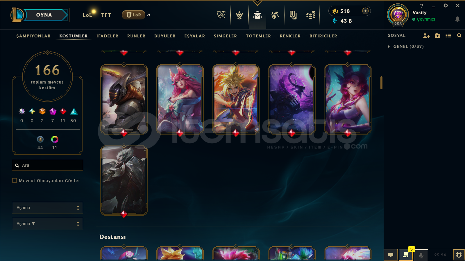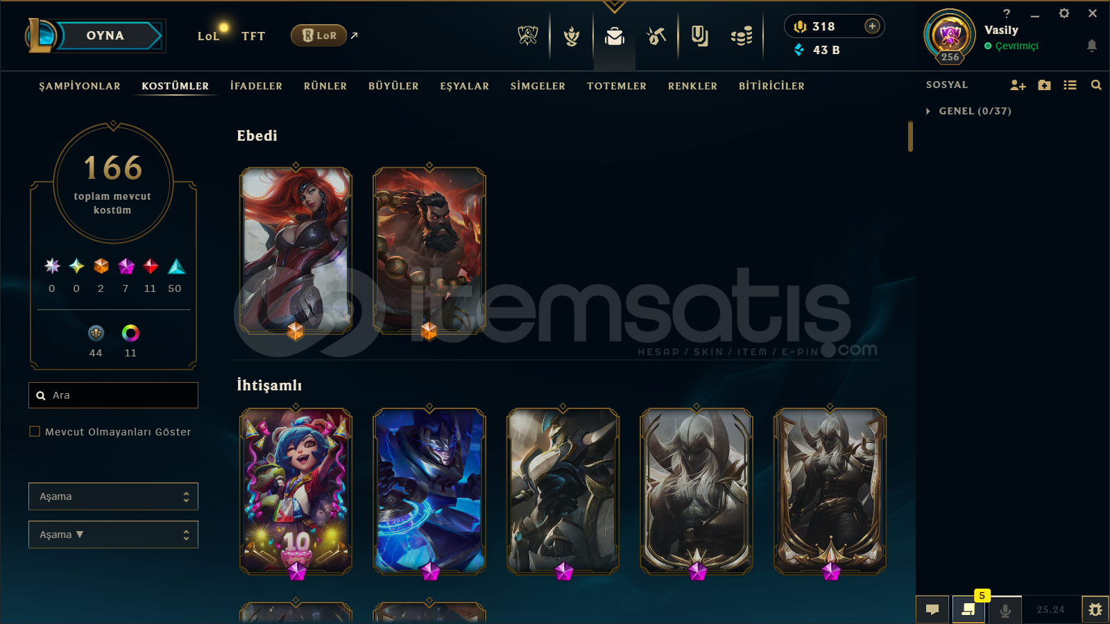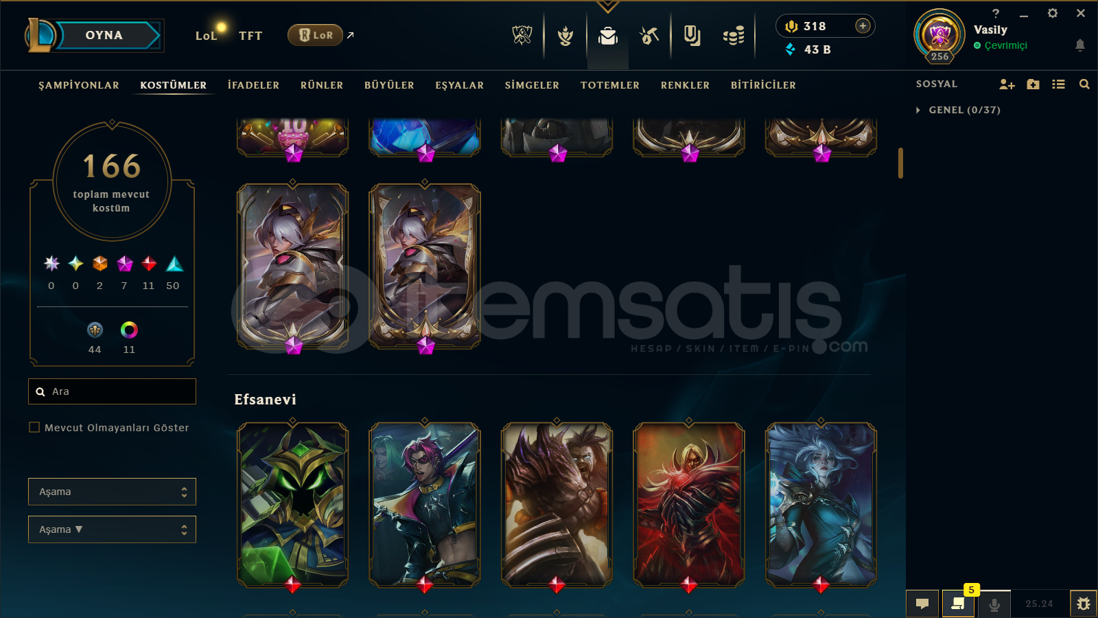 🔷 League of Legends Bilgileri🔹 Sunucu: TR🔹 Level: 256🔹 Sıralama:• Tek/Çift: Unranked• Esnek 5v5: Unranked🔹 Mavi Öz: 43 bin🔹 Şampiyon Sayısı : 150🔹 Kostüm Sayısı: 166📊 OP.GG Profili : https://op.gg/tr/lol/summoners/TR/Vasily-1234✅ Hesaplarımın Tamamen ArkasındayımPiyasadaki bir&...