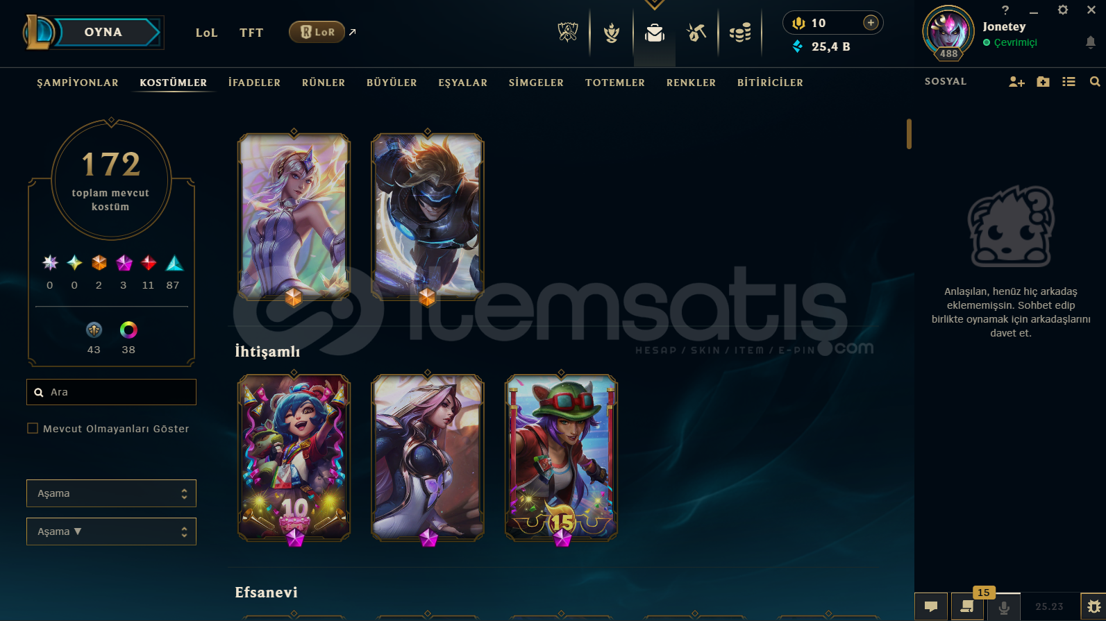 SUNUCU:TRRANK:GOLD IILEVEL:408TOPLAM LOLDE:174 SKİN2 EBEDİ3 İHTİŞAMLI11 EFSANEVİ87 DESTANSI43 HATIRA38 RENK PAKETİTOPLAM AÇIK ŞAMPİYONLAR:FULLSATIN ALINDIKTAN SONRA MAİL VE ŞİFRE DEĞİŞİMİ TARAFINIZA YAPILACAKTIR.🧨 Ürün AçıklamasıErişim ve E-Posta BilgileriSatın alma işlemi tamamlandıktan sonra tarafınıza kullanıcı adı ve ş...
