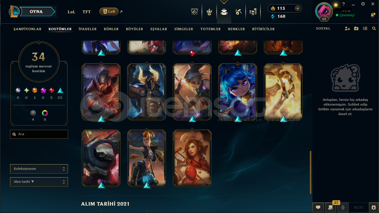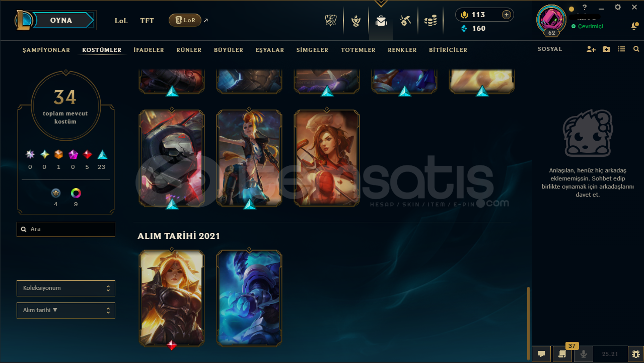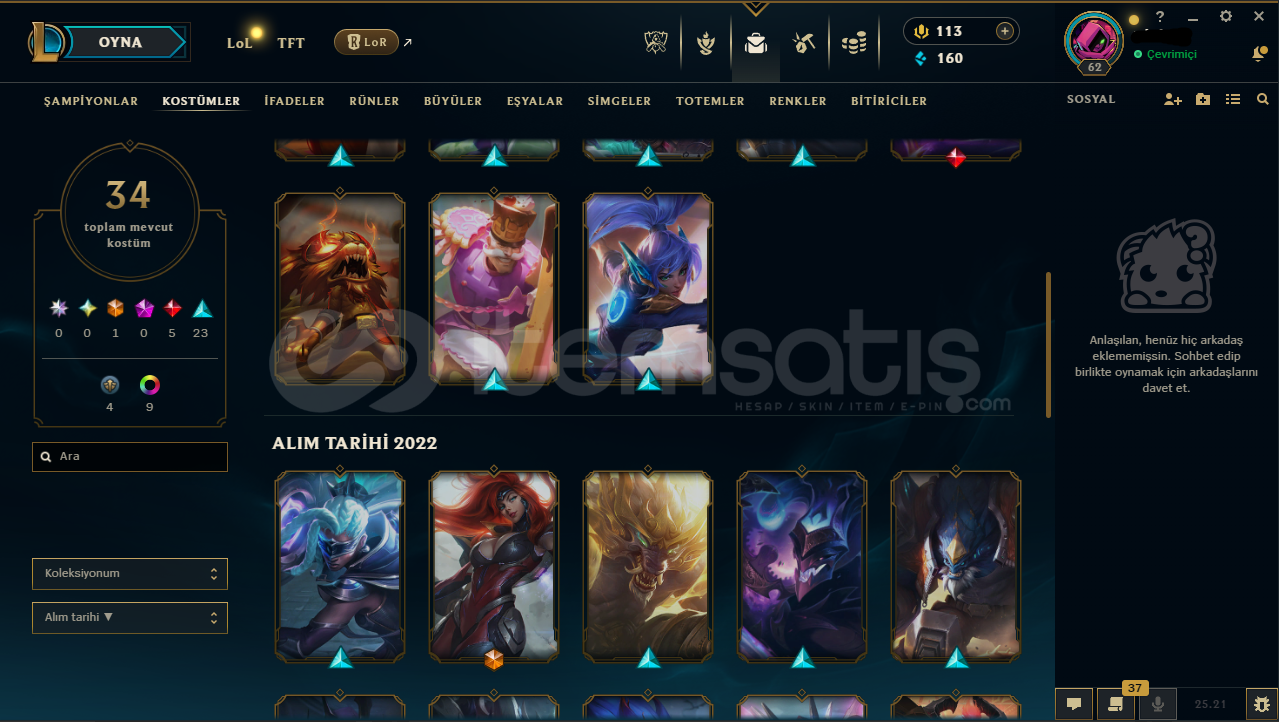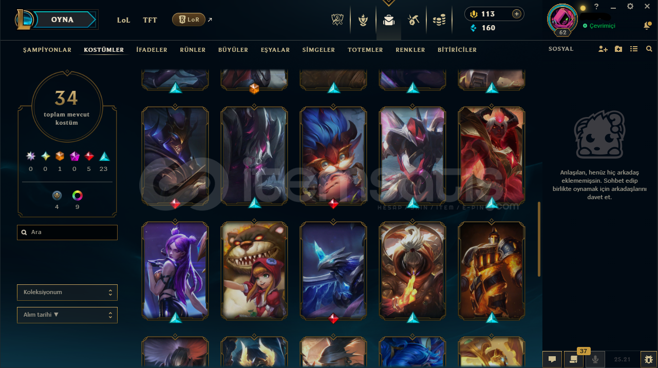 Hesabın E-Posta'sı ve Tüm bilgileri değiştirilebilir.Teslimatlar Otomatik Yapılmaktadır, 7/24 satın alır almaz tüm hesap bilgilerine ulaşabilirsiniz...Dereceli Direkt Girilebilir.160 Mavi Öz & 2763 Turuncu Öz Bulunmaktadır.Hesabınızı satın aldıktan sonra sizden başka kimsenin erişimi olmaz.62 Level - Unranked (TR) Hesaptır.34 Kostüm + 9 Remk Paketi ve 69 Şampiyon...