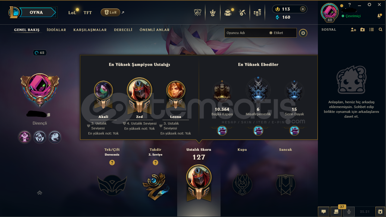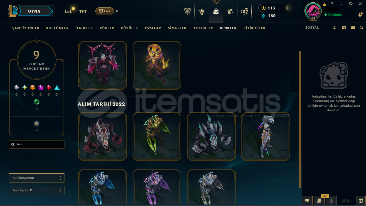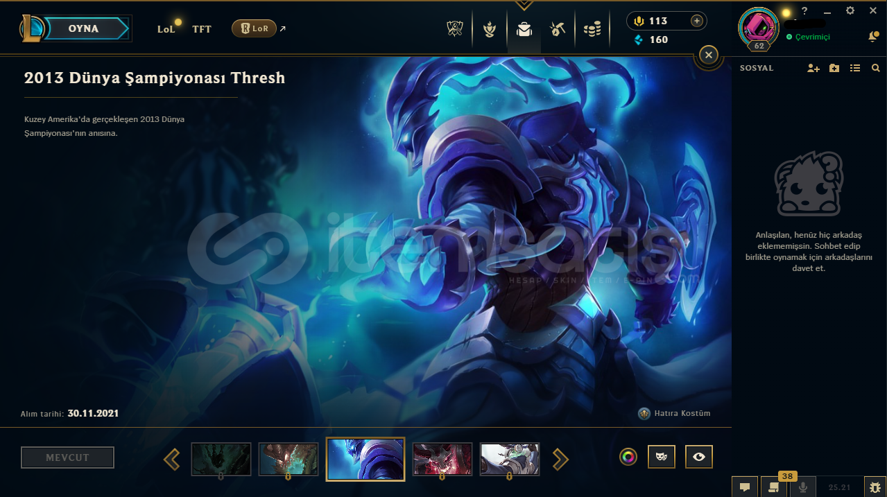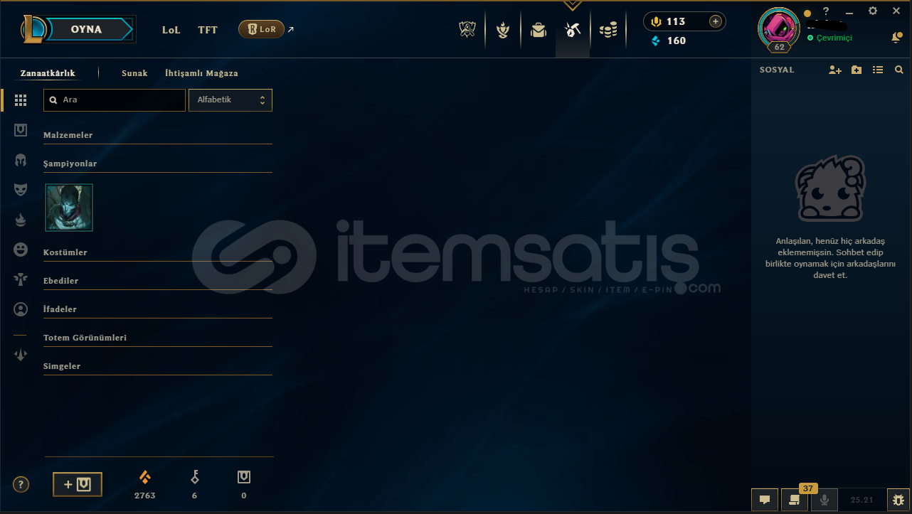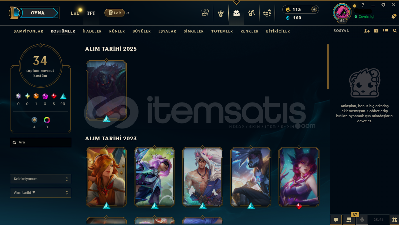 Hesabın E-Posta'sı ve Tüm bilgileri değiştirilebilir.Teslimatlar Otomatik Yapılmaktadır, 7/24 satın alır almaz tüm hesap bilgilerine ulaşabilirsiniz...Dereceli Direkt Girilebilir.160 Mavi Öz & 2763 Turuncu Öz Bulunmaktadır.Hesabınızı satın aldıktan sonra sizden başka kimsenin erişimi olmaz.62 Level - Unranked (TR) Hesaptır.34 Kostüm + 9 Remk Paketi ve 69 Şampiyon...