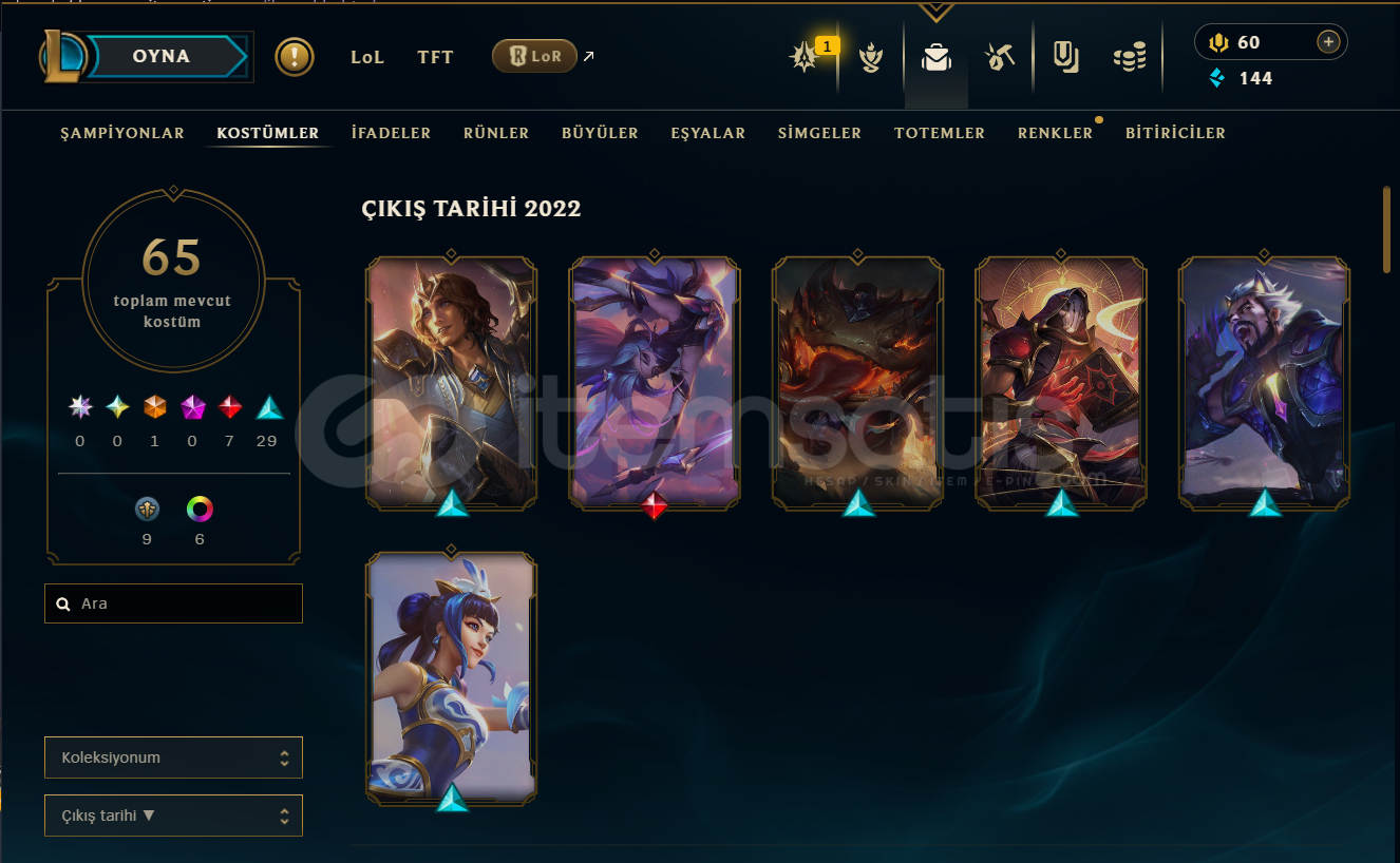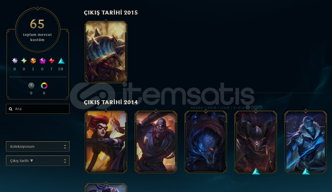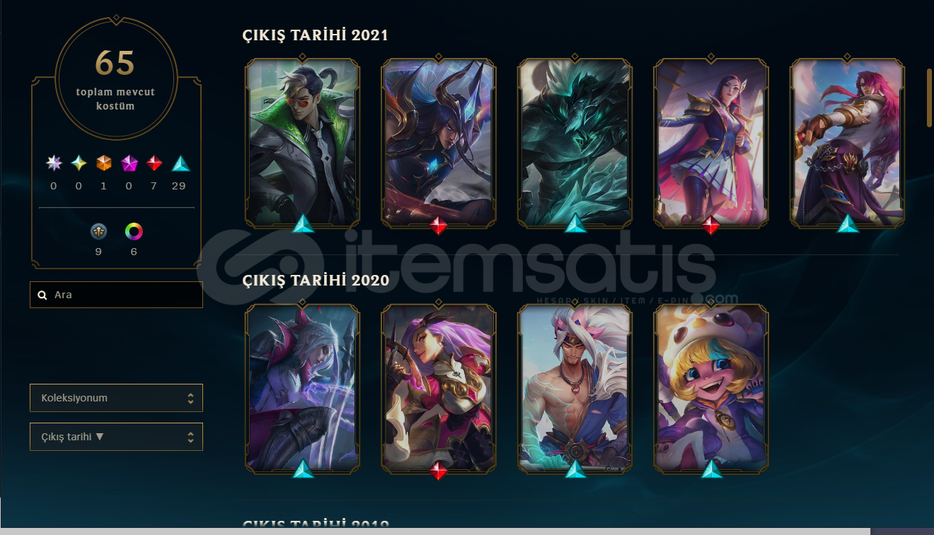 HESAPDAKİ DEĞERLİ SKİNLER FOTOĞRAFTA EKLİDİR, . EKSTRA OLARAK AÇILMAYI BEKLEYEN ARCANE:SAVAŞÇI Vİ, SAVAŞ AKADEMİSİ EZREAL,UZAY SERÜVENİ KAYN GİBİ SKİNLER DE MEVCUTTUR. BAZI ŞAMPİYONLARIN SKİNLERİNİN RENK PAKETLERİ DE MEVCUT