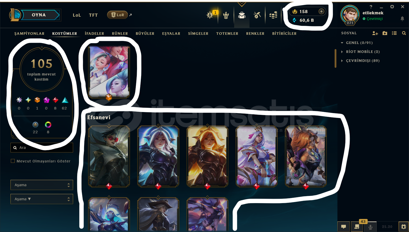 Aktif olmasam bile otomatik teslimat yapılmaktadır.En hızlı ve güvenilir alışveriş yapabileceğiniz mağazaya hoşgeldiniz :+4500 Başarılı satış güvencesiyle..MAİL : KENDİ MAİLİNİZE DEVREDİLECEKRANK : TEK ÇİFT ELMAS IV / ESNEK PLATİN IV / TFT BRONZ IVHERO : 138SKIN : 105SİMGE SAYISI : 189MAVİ ÖZ :&nb...