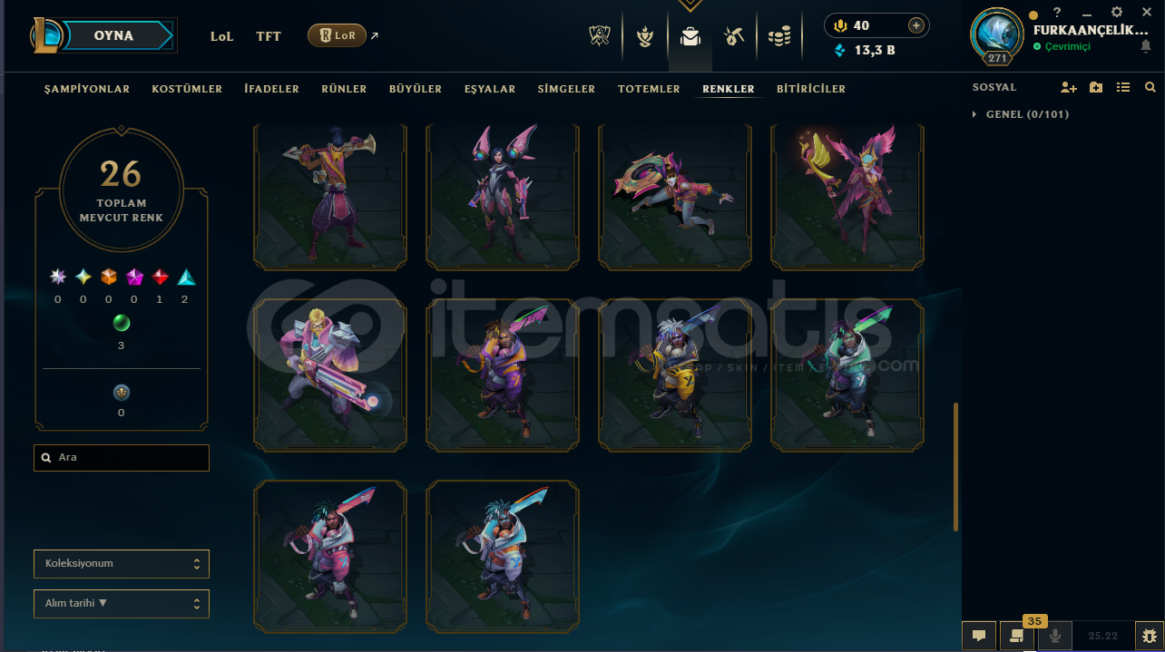 TR server271 lvl 98 kostüm fulle yakın champ özle fulleniyor esnek zümrüt 3 tekçift bronze 325 lvl ekko10 lvl zileanhesapta herhangi bir ban yoktur mail değişimi yapılıcaktırsatın alım sonrası hızlıca teslim ediyorum .
