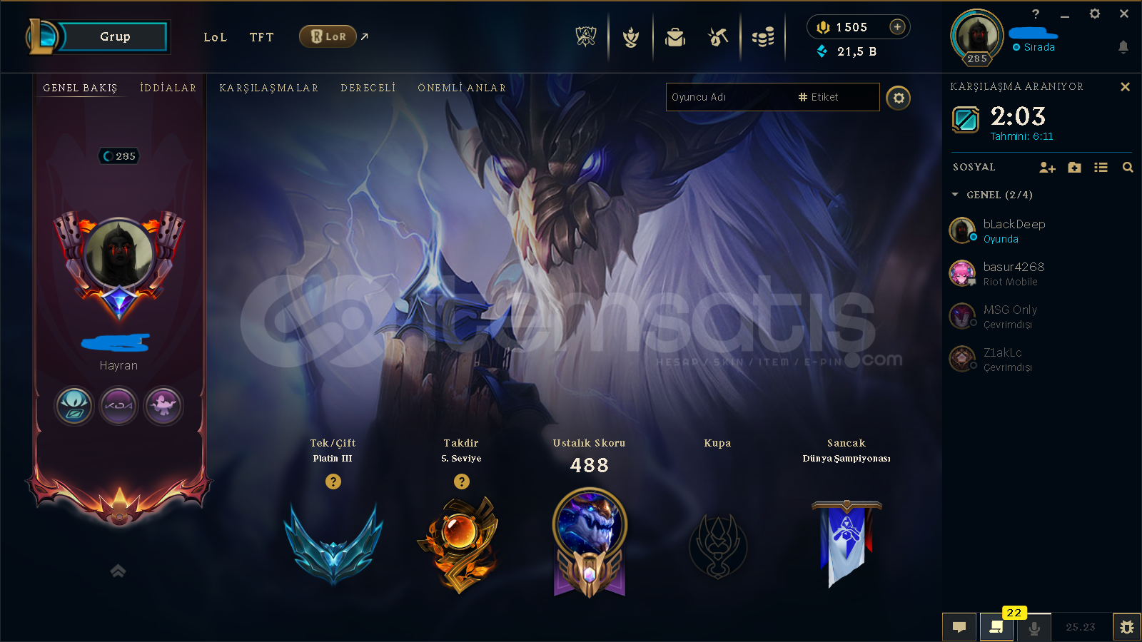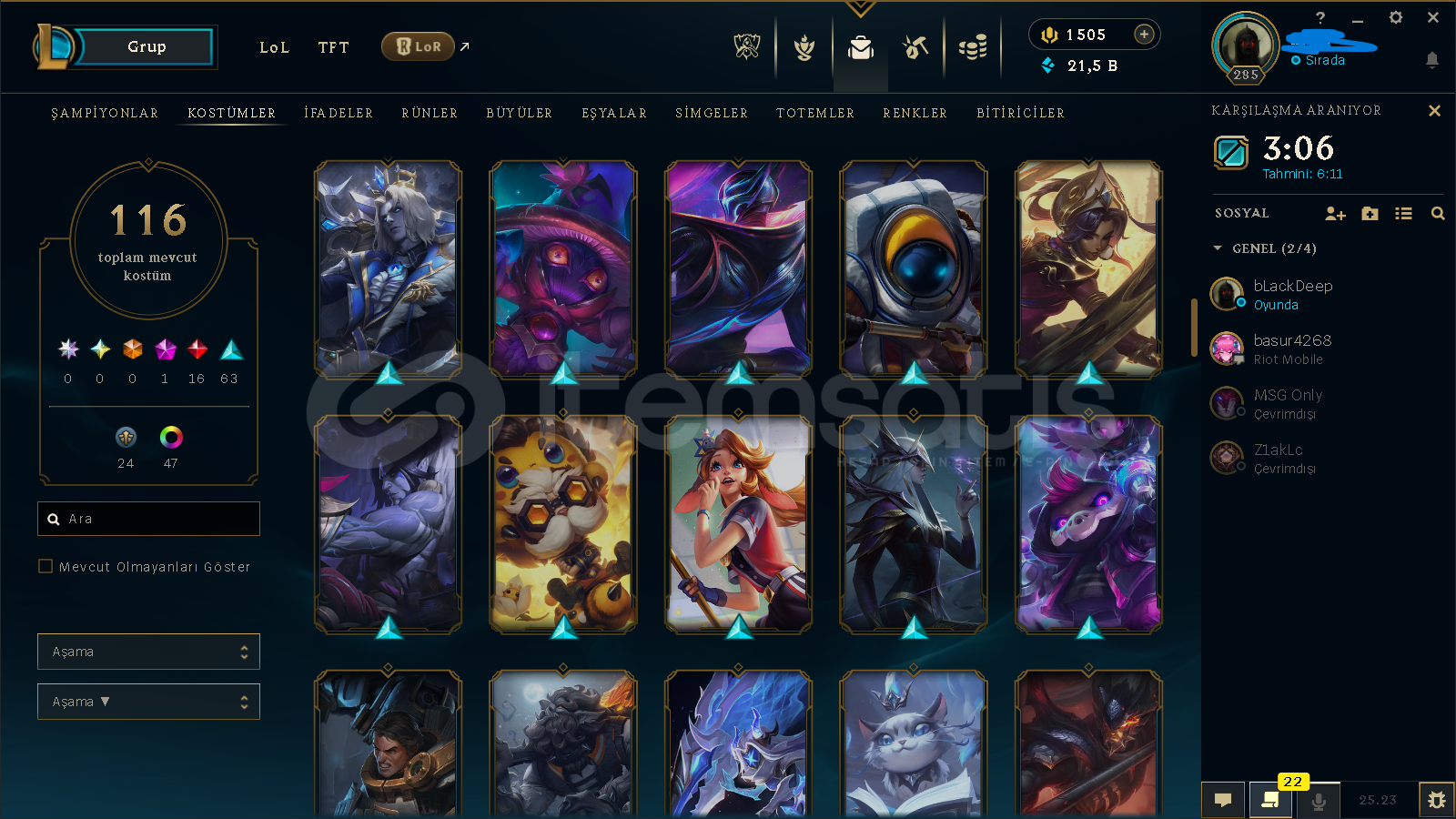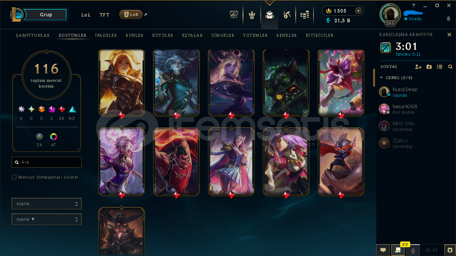 HESAPTA DEĞERLİ BİR ÇOK KOSTÜM VARDIR 21K MAVİ ÖZ BULUNMAKTADIR VE NERDEYSE TÜM KARAKTERLER AÇIKTIR GEÇEN SEZON ZÜMRÜT BİTİRDİ HESAPTA 1505 RP BULUNMAKTADIR HESABI ALAN ARKADAŞ RP İLE İSTEDİĞİ KOSTÜMÜ DE ALABİLİR
