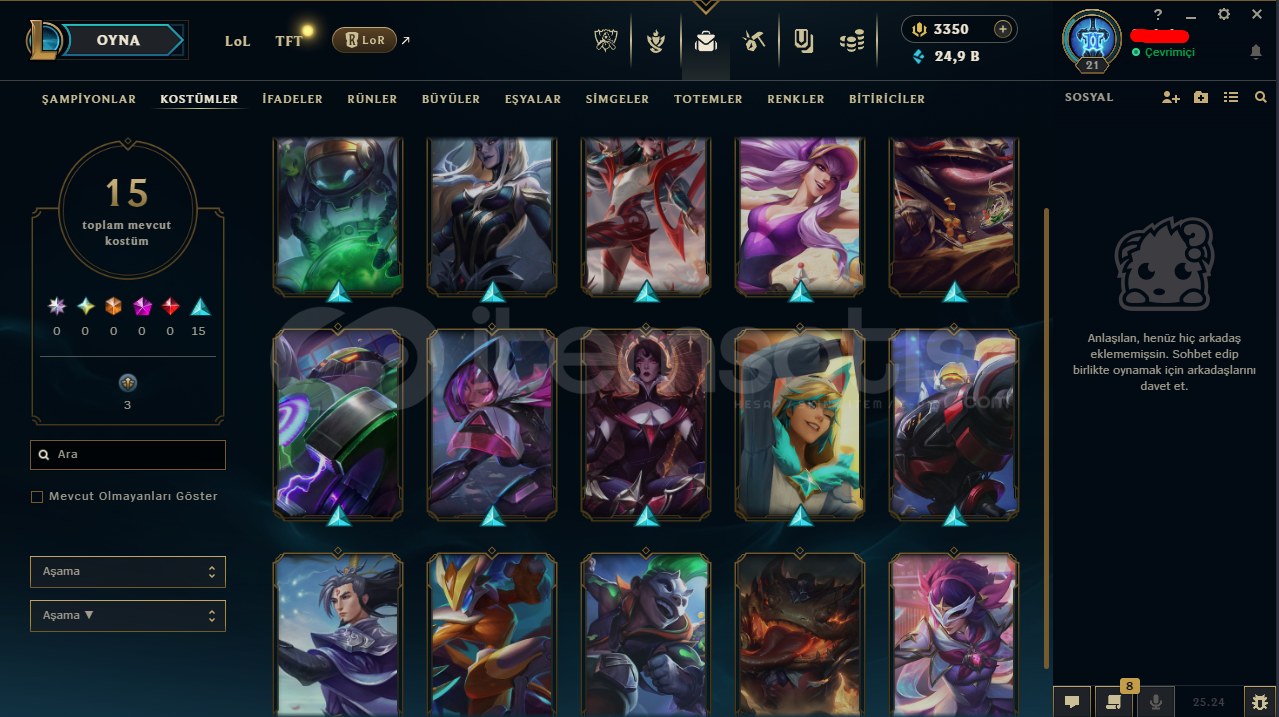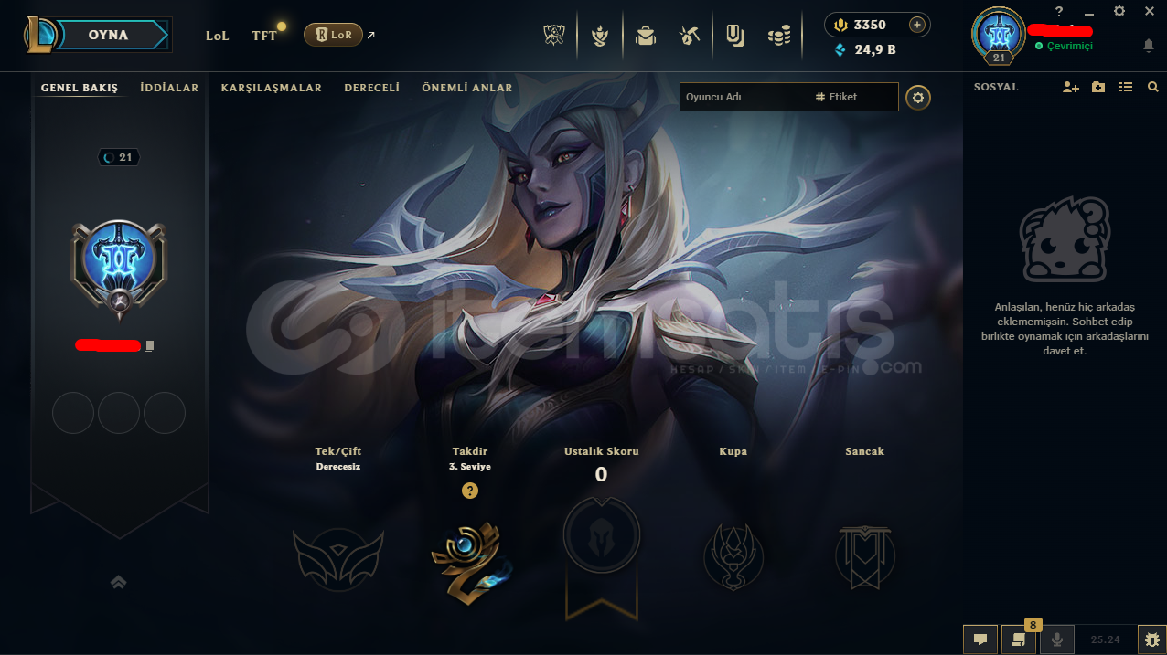 NA Sunucudur.21 Leveldir.3350 RP, 24,9K Mavi Öz, 6600 Turuncu Öz Bulunmaktadır. 23 Şampiyon, 15 Kostüm, 0 Renk Bulunmaktadır.Derecesizdir.Valorant Ranked Girmez.
