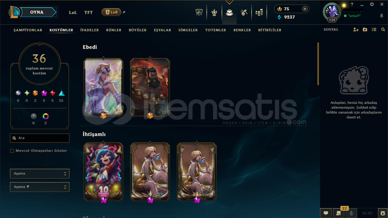 Hesabın E-Posta'sı ve Tüm bilgileri değiştirilebilir.Teslimatlar Otomatik Yapılmaktadır, 7/24 satın alır almaz tüm hesap bilgilerine ulaşabilirsiniz...Dereceli Direkt Girilebilir.9237 Mavi Öz & 1044 Turuncu Öz + 40 Anahtar Bulunmaktadır.Hesabınızı satın aldıktan sonra sizden başka kimsenin erişimi olmaz.134 Level - Bronz III(TR) Hesaptır.36 Kostüm ve 104 Şampiyon...