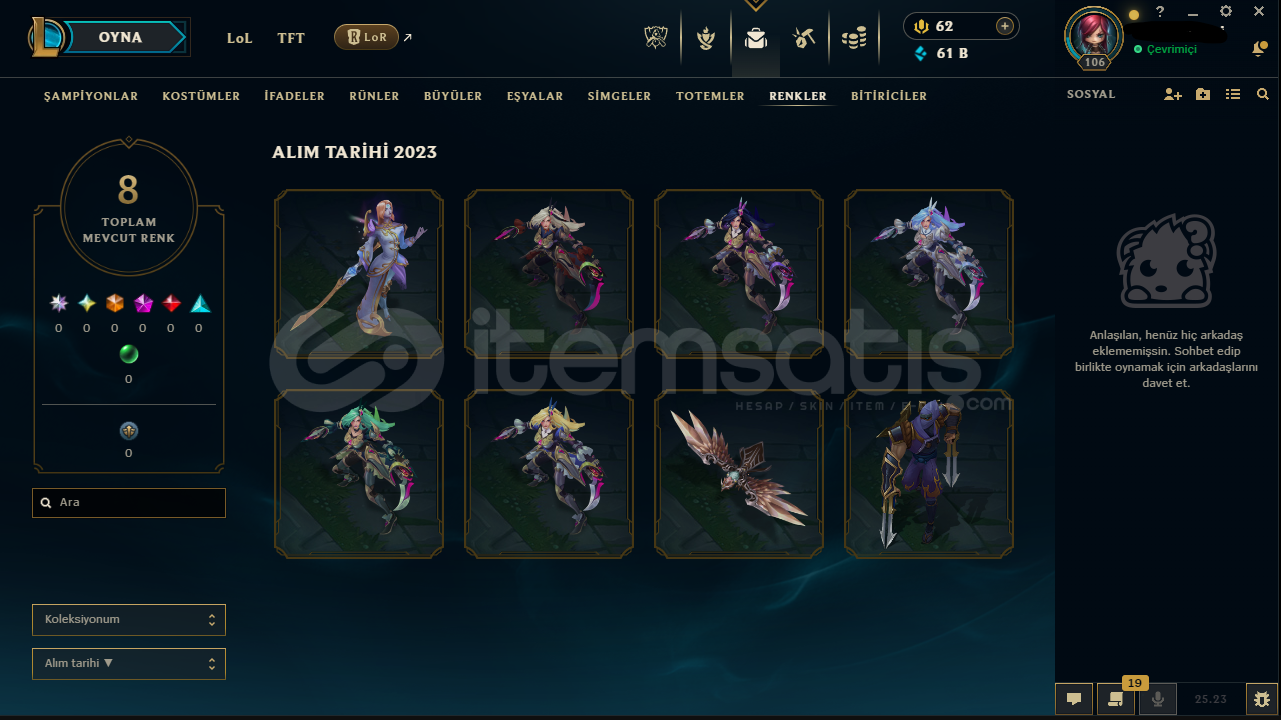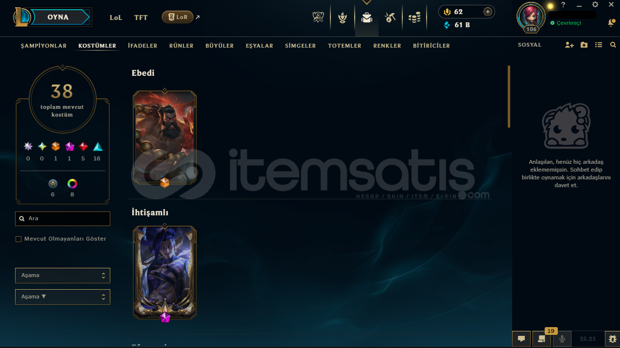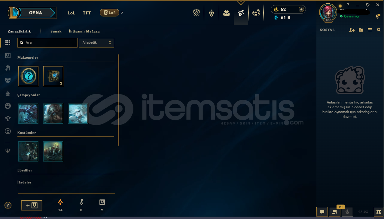 Hesabın E-Posta'sı ve Tüm bilgileri değiştirilebilir.Teslimatlar Otomatik Yapılmaktadır, 7/24 satın alır almaz tüm hesap bilgilerine ulaşabilirsiniz...Dereceli Direkt Girilebilir.61K Mavi Öz & 14 Turuncu Öz + 2 Sandık Bulunmaktadır.Hesabınızı satın aldıktan sonra sizden başka kimsenin erişimi olmaz.106 Level - GOLD III (EUW) Hesaptır.38 Kostümve 67 Şampiyon bulun...