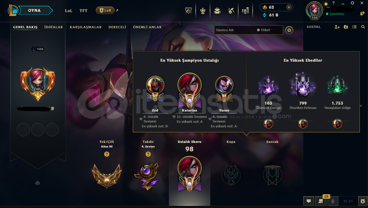 ⭐TR+38SKIN+106LVL+GOLD3+67CHAR+PR GÖLGE YASUO⭐
