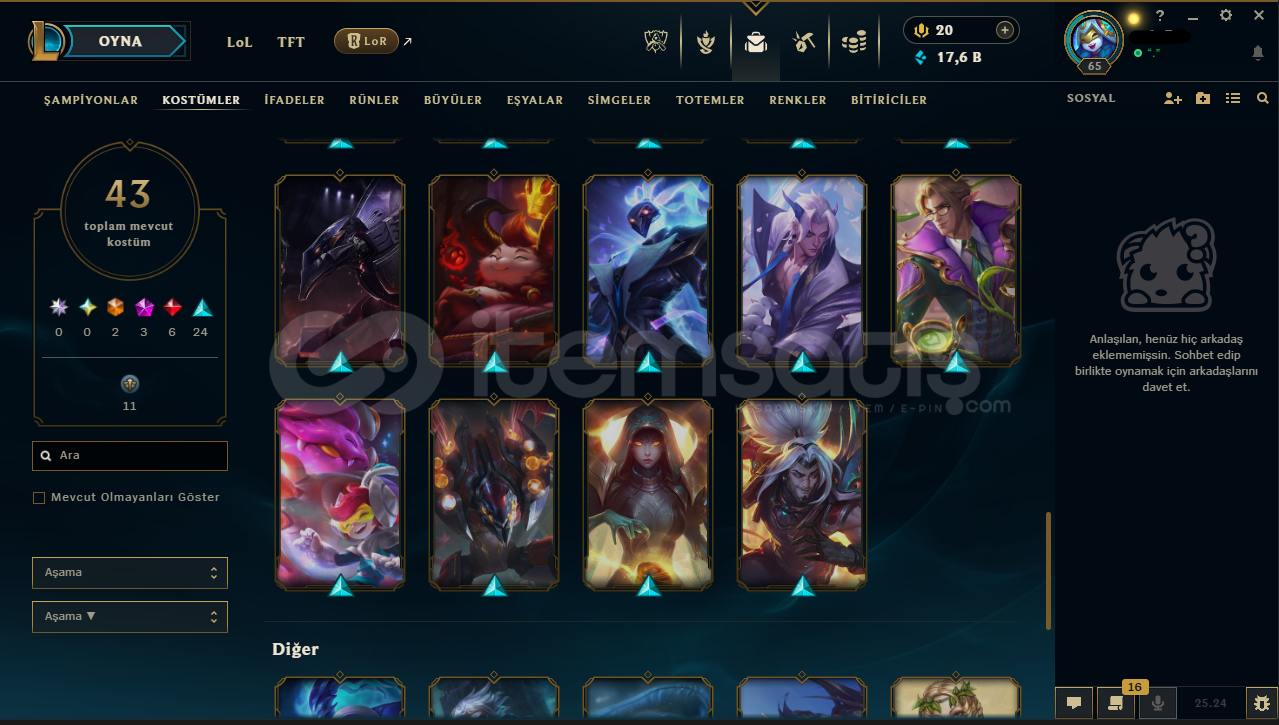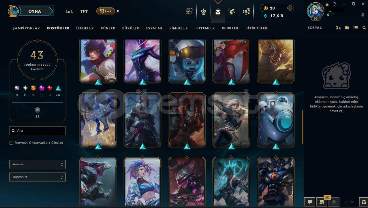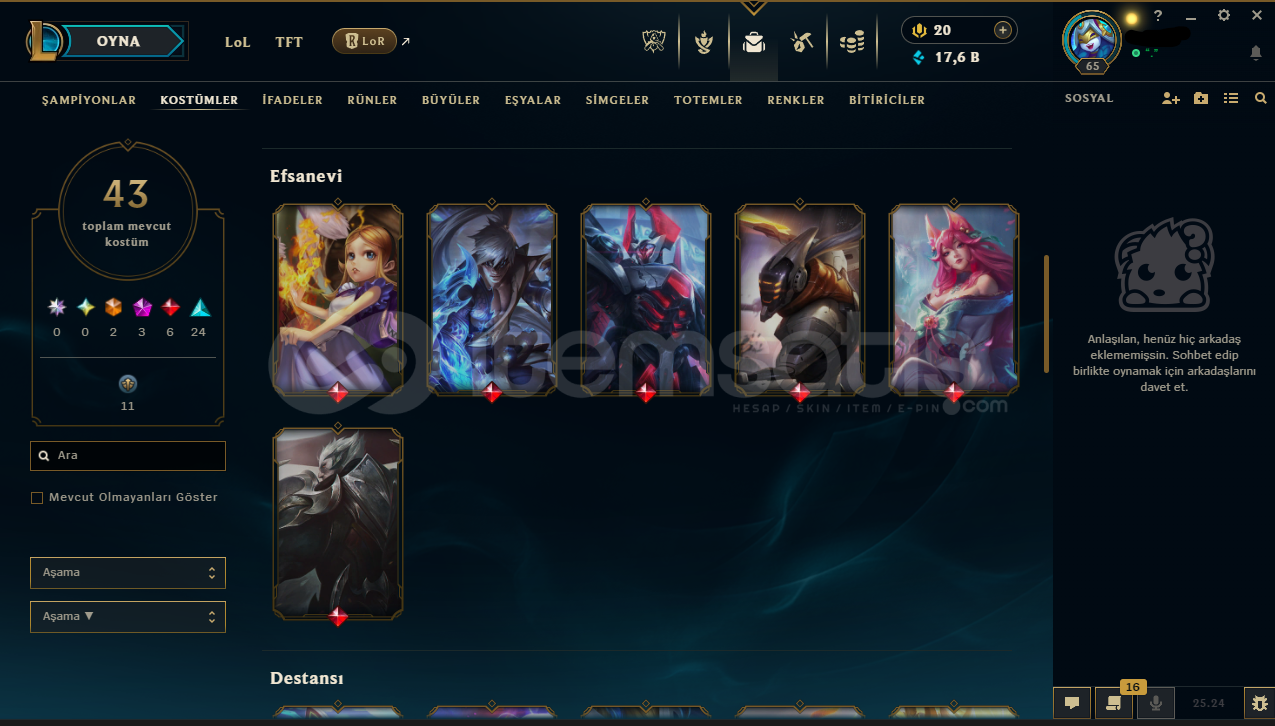 Hesabın E-Posta'sı ve Tüm bilgileri değiştirilebilir.Teslimatlar Otomatik Yapılmaktadır, 7/24 satın alabilirsiniz. Hemen Eposta - Şifre - Mail Teslim edilmektedir.Dereceli Direkt Girilebilir.17,6 K Mavi Öz & 927 Turuncu Öz Bulunmaktadır.Hesabınızı satın aldıktan sonra sizden başka kimsenin erişimi olmaz..65 Level + BRONZ 1 (TR) Hesaptır.43 Kostüm ve 83 Şampiyon bulunmaktadı...