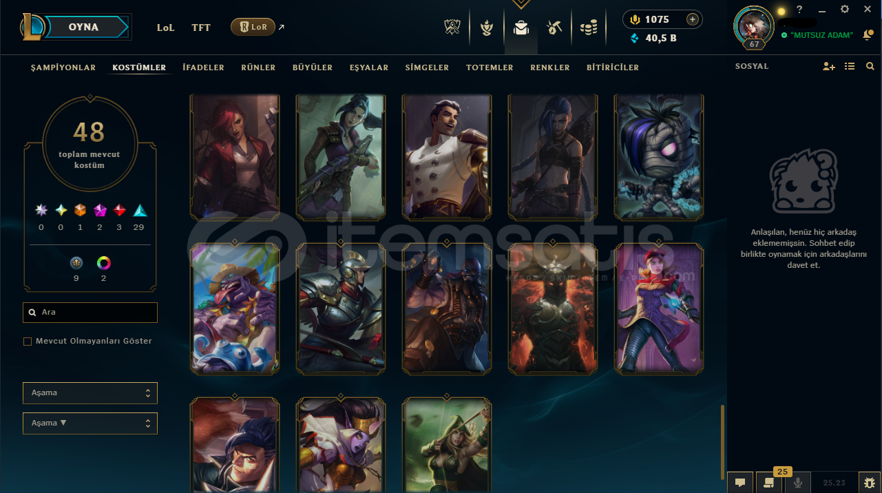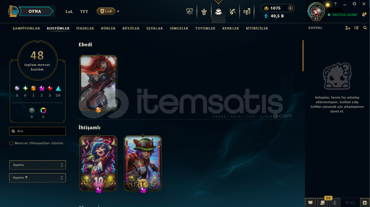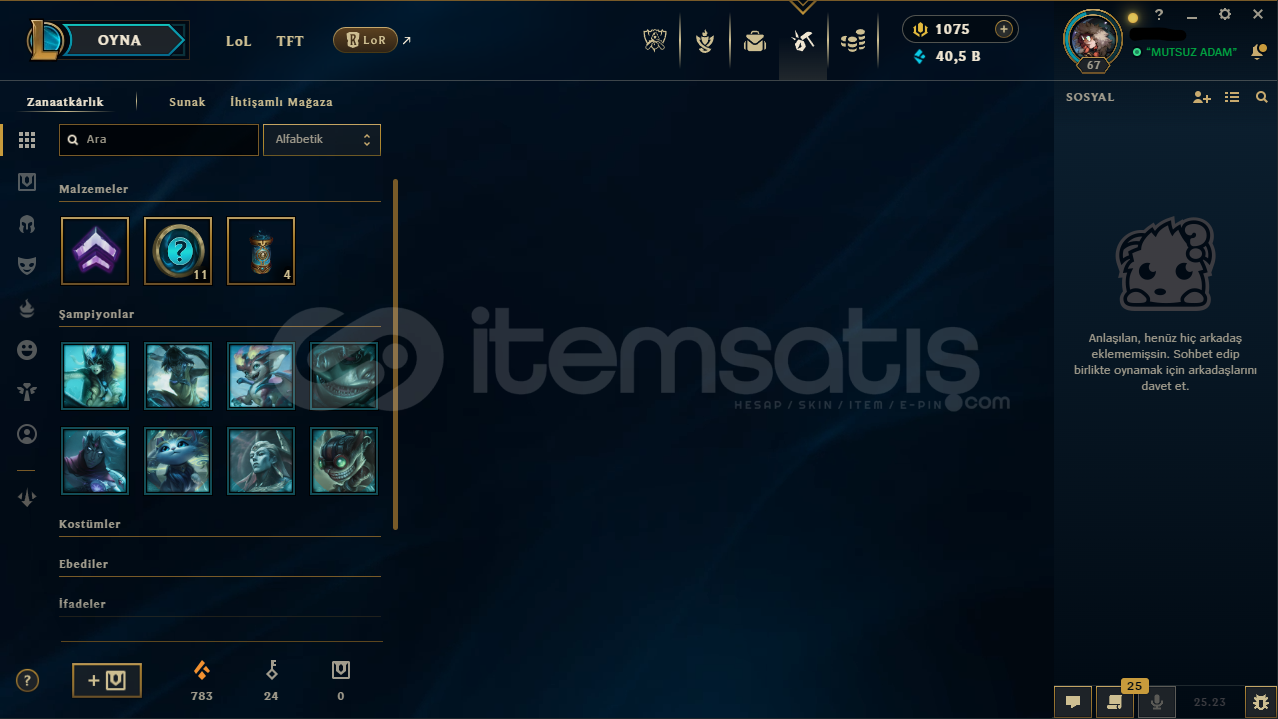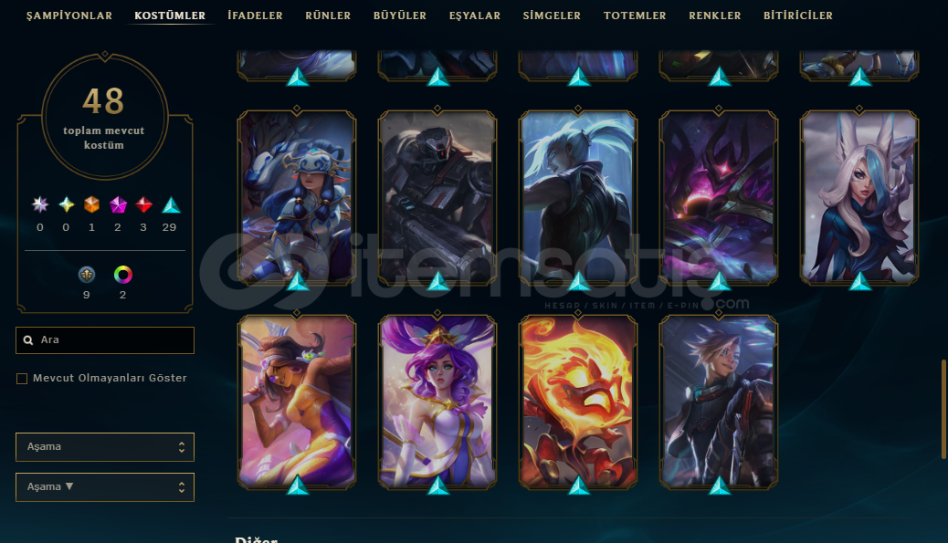 Hesabın E-Posta'sı ve Tüm bilgileri değiştirilebilir.Teslimatlar Otomatik Yapılmaktadır, 7/24 satın alır almaz tüm hesap bilgilerine ulaşabilirsiniz...Dereceli Direkt Girilebilir.40,5K Mavi Öz & 783 Turuncu Öz + 24 Anahtar Bulunmaktadır.Hesabınızı satın aldıktan sonra sizden başka kimsenin erişimi olmaz.67 Level - Unranked (TR) Hesaptır.48 Kostüm ve 91 Şampiyon(g...