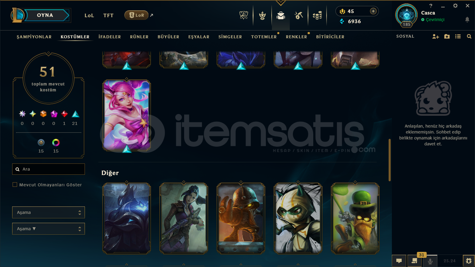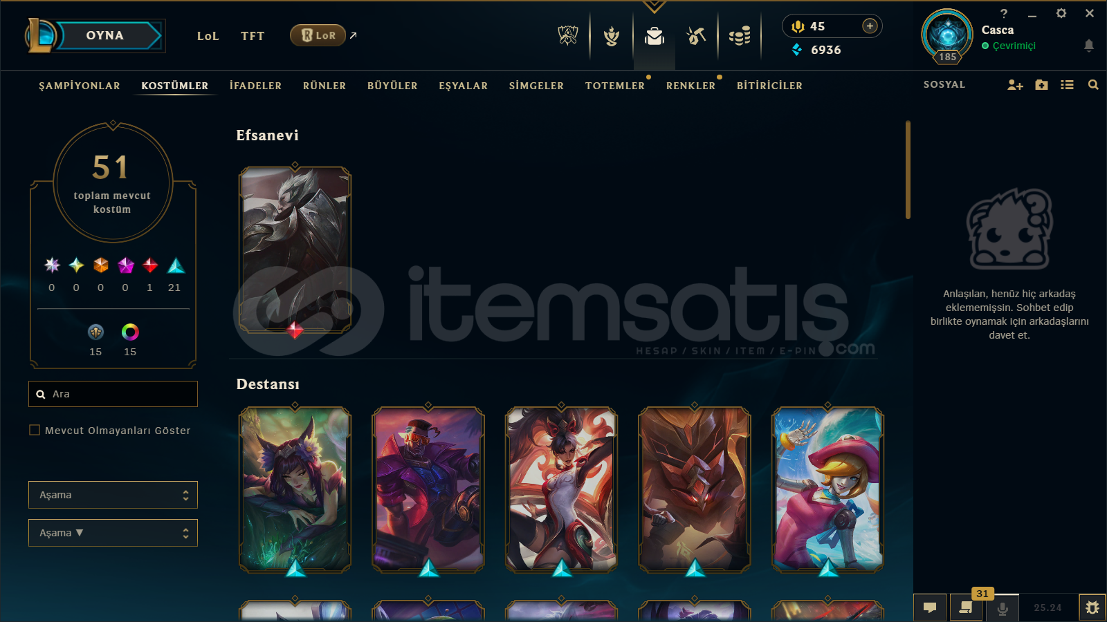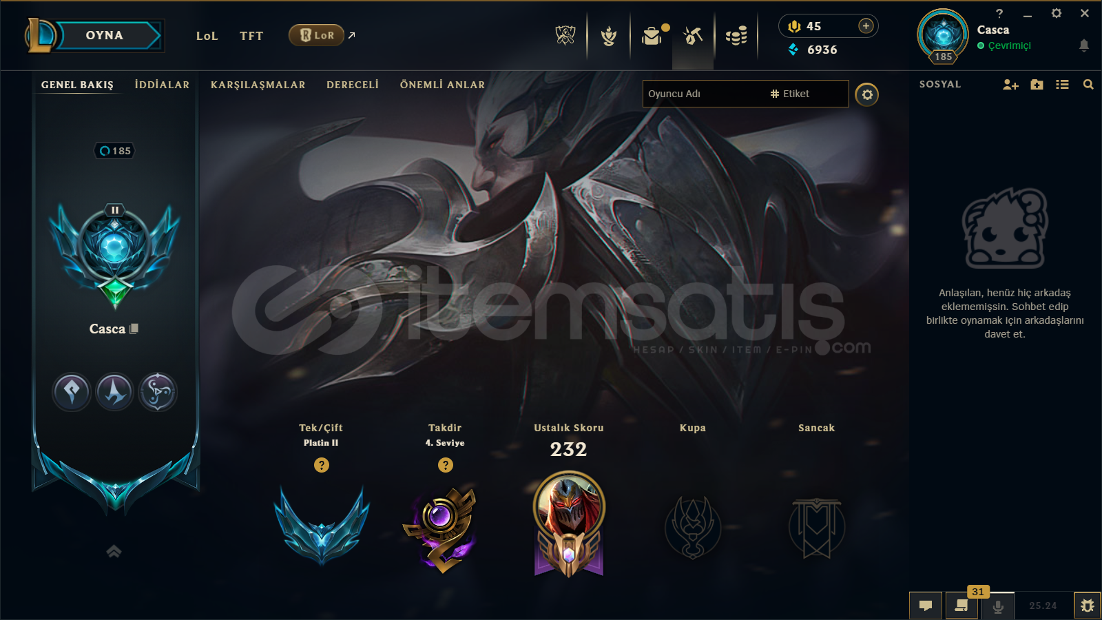 🔷 League of Legends Bilgileri🔹 Sunucu: TR🔹 Level: 185🔹 Sıralama:• Tek/Çift: Platin 2• Esnek 5v5: Gümüş 1🔹 Mavi Öz: 6936🔹 Şampiyon Sayısı : 129🔹 Kostüm Sayısı: 51📊 OP.GG Profili : https://op.gg/tr/lol/summoners/tr/Casca-1881✅ Hesaplarımın Tamamen ArkasındayımPiyas...