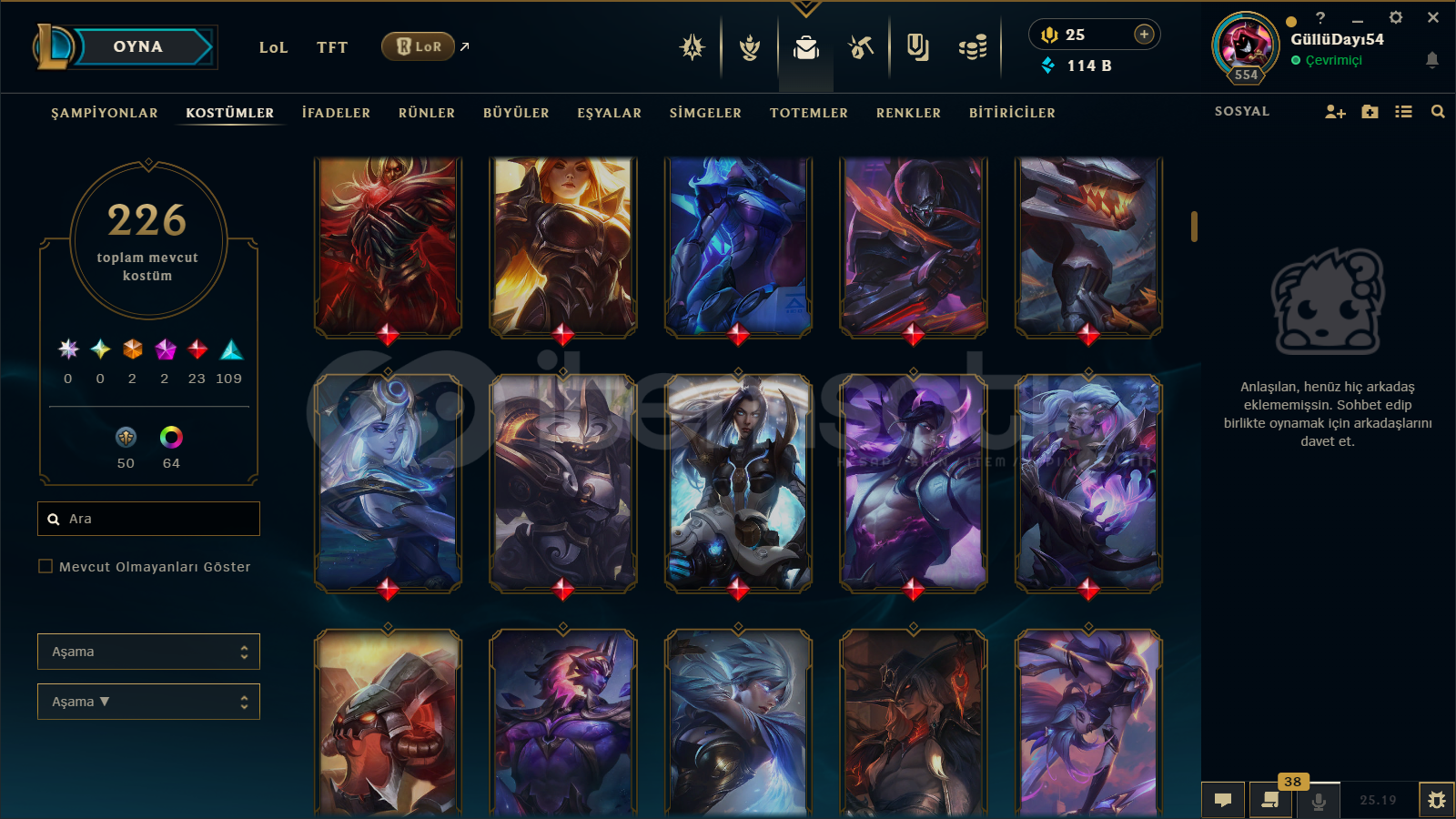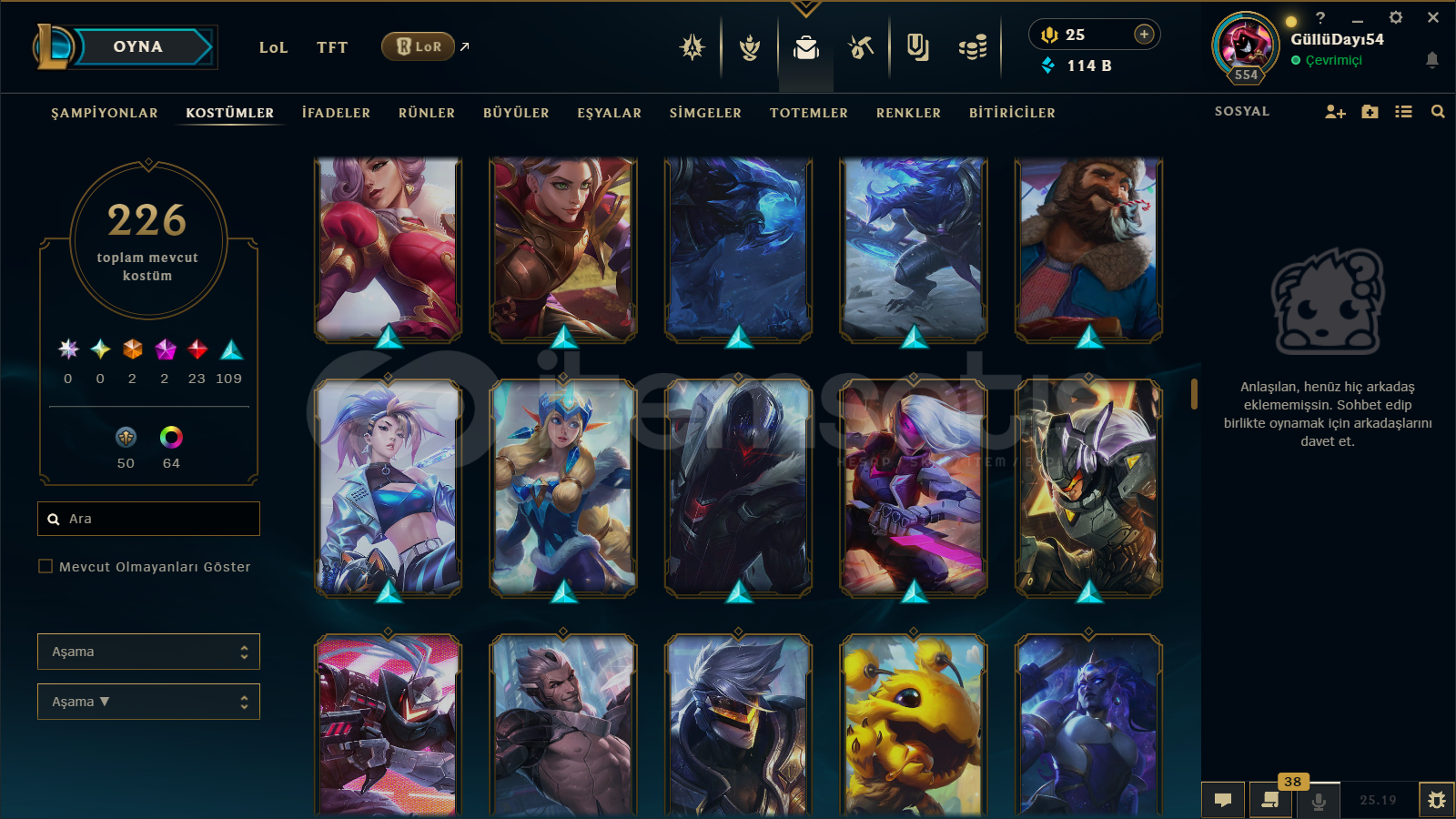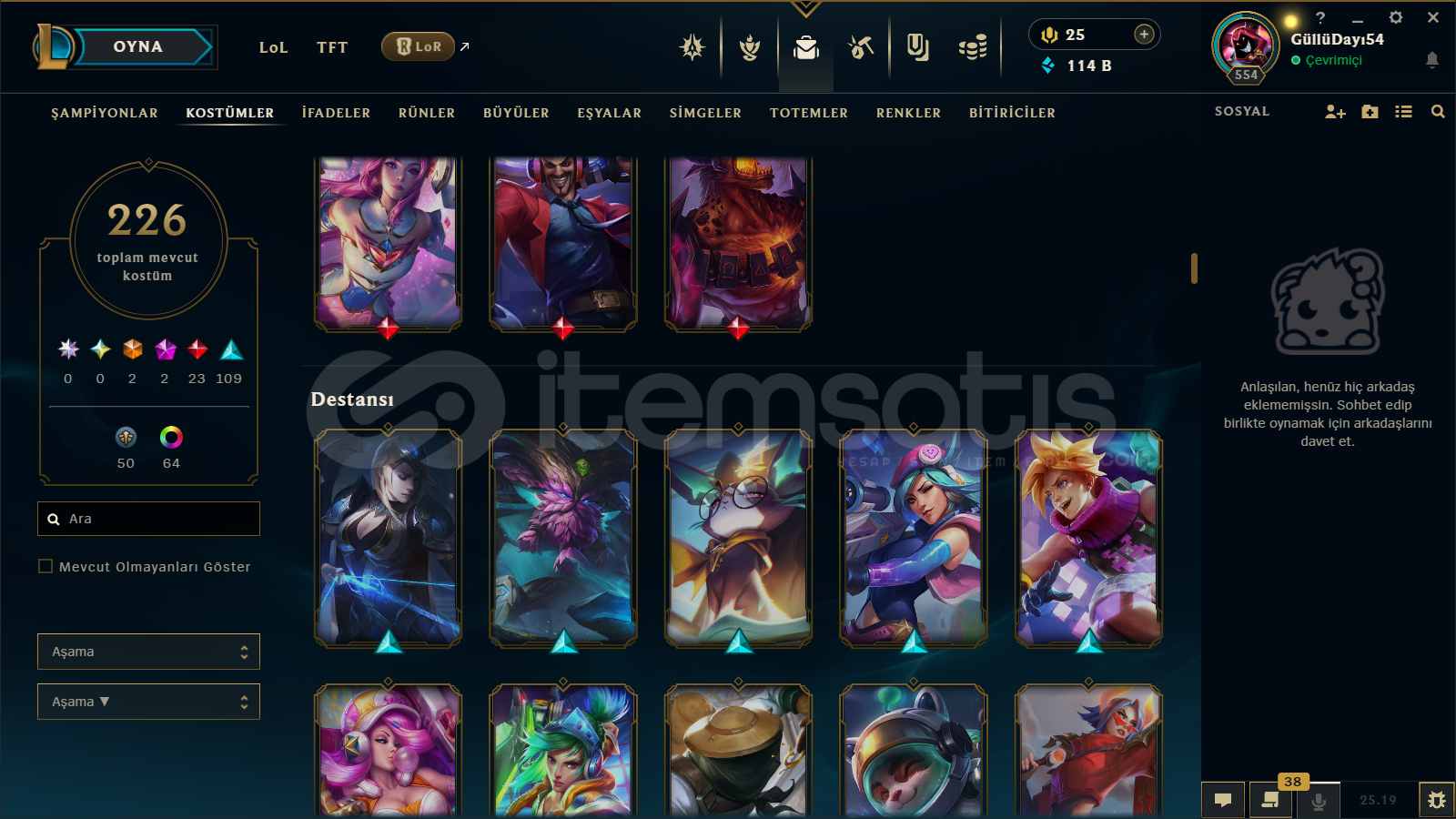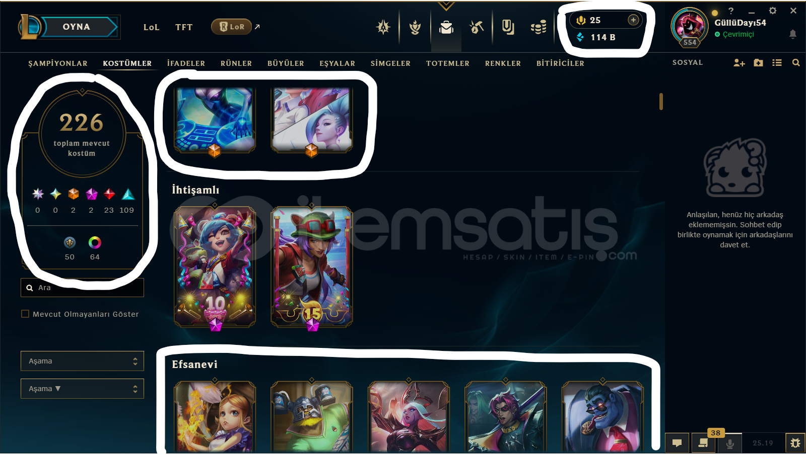 Aktif olmasam bile otomatik teslimat yapılmaktadır.En hızlı ve güvenilir alışveriş yapabileceğiniz mağazaya hoşgeldiniz :+4250 Başarılı satış güvencesiyle..MAİL : KENDİ MAİLİNİZE DEVREDİLECEKRANK :TEK ÇİFT ALTIN IV / ESNEK GÜMÜŞ IV / TFT ALTIN IIIHERO : FUL HERO 171/171SKIN : 226SİMGE SAYISI : 354MAVİ ...