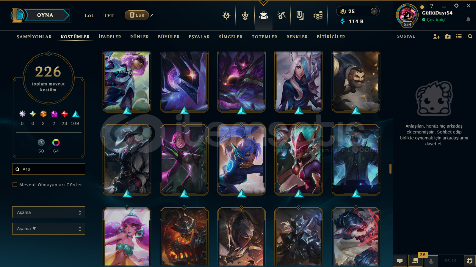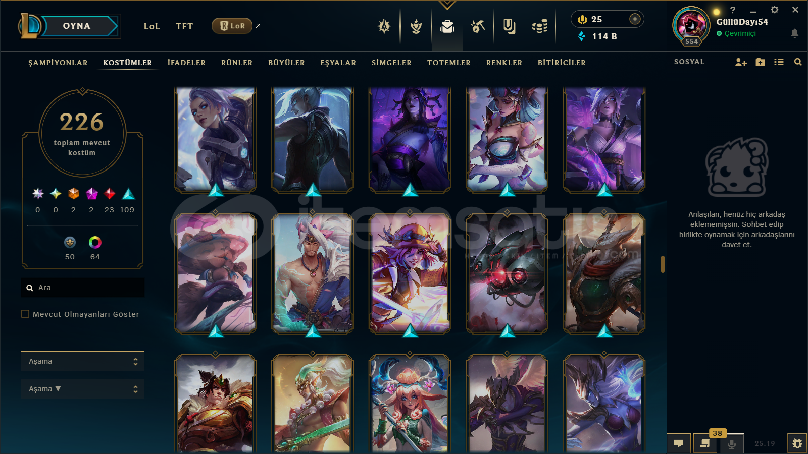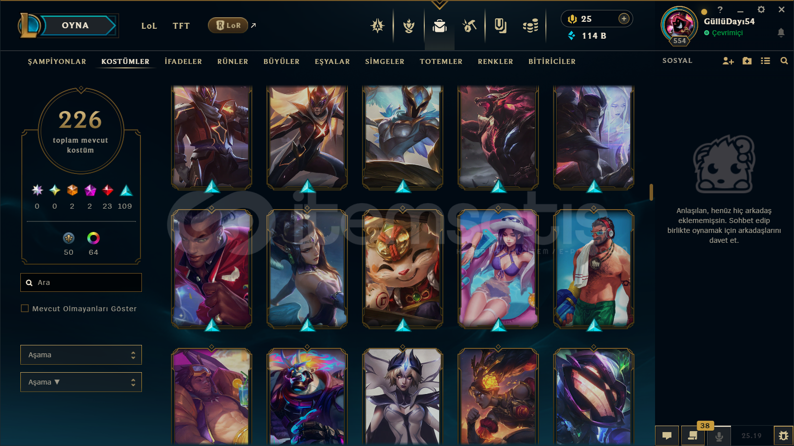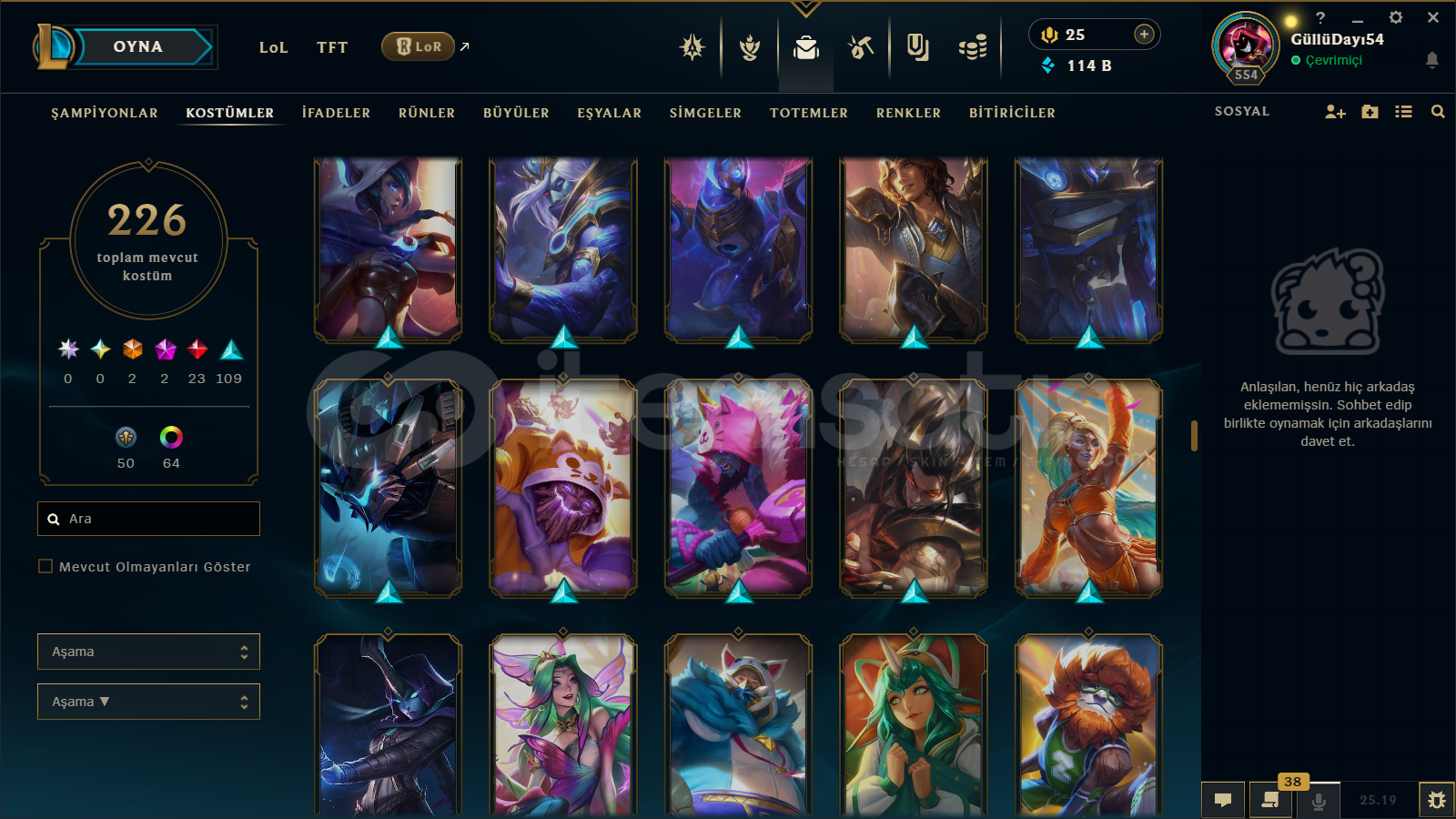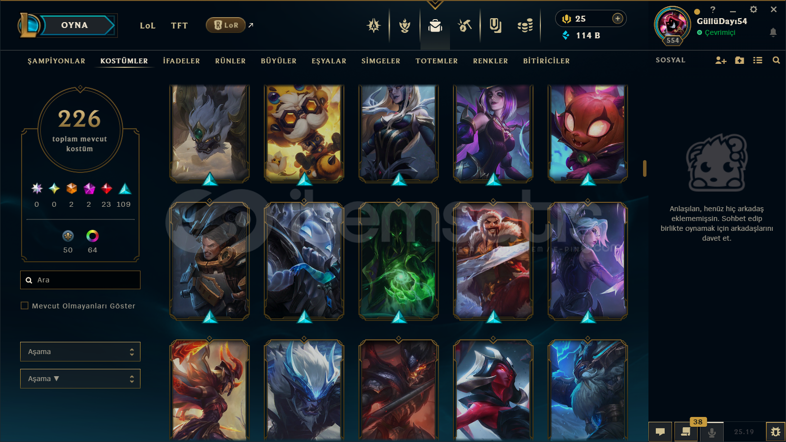 Aktif olmasam bile otomatik teslimat yapılmaktadır.En hızlı ve güvenilir alışveriş yapabileceğiniz mağazaya hoşgeldiniz :+4250 Başarılı satış güvencesiyle..MAİL : KENDİ MAİLİNİZE DEVREDİLECEKRANK :TEK ÇİFT ALTIN IV / ESNEK GÜMÜŞ IV / TFT ALTIN IIIHERO : FUL HERO 171/171SKIN : 226SİMGE SAYISI : 354MAVİ ...
