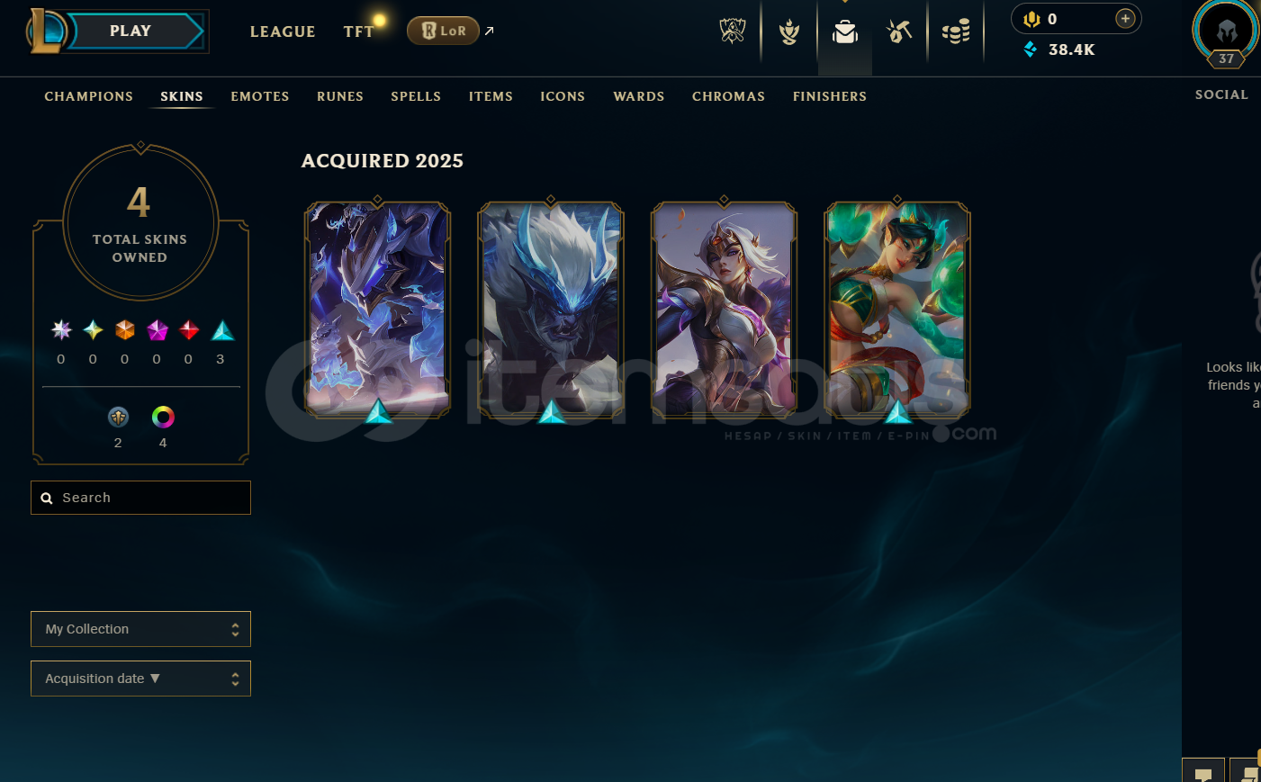 HESAP DETAYLARI:Hesap hiç ban yememiştir ve takdir seviyesi 4 dür.Hesap TR Tek/Çift Zümrüt 3 - 88 Lp - 37 Win 22 Lose 63 Winrate TR LoL Hesabıdır.İçerisinde 38430 Mavi Öz 4 Kostüm 30 Hero ve 3 Adet İade Hakkı Mevcuttur.HESAP HAKKINDA:Kendi mail adresinize kayıt edebilir, etkinleştirmeyi kaldırabilir ve şifresini değiştirebilirsiniz.Hesaplarımızda hiç bir sıkınt...