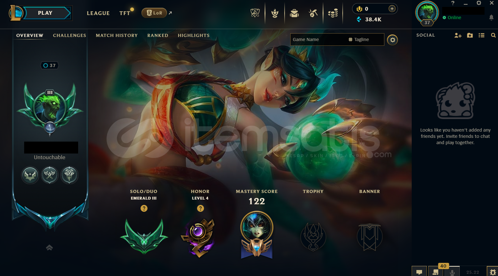 Hesap TR Tek/Çift Zümrüt 3 - 88 Lp - 37 Win 22 Lose 63 Winrate TR LoL Hesabıdır.