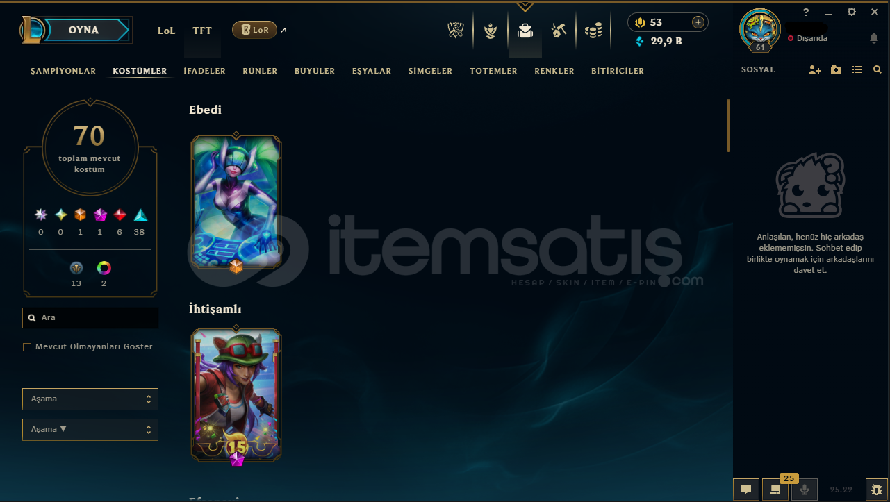 Hesabın E-Posta'sı ve Tüm bilgileri değiştirilebilir.Teslimatlar Otomatik Yapılmaktadır, 7/24 satın alır almaz tüm hesap bilgilerine ulaşabilirsiniz...Dereceli Direkt Girilebilir.29,9k Mavi Öz & 53 Turuncu Öz + 18 Anahtar Bulunmaktadır.Hesabınızı satın aldıktan sonra sizden başka kimsenin erişimi olmaz.61 Level - SoloQ/Bronz 2(TR) Hesaptır.70 Kostüm ve 118 Şampiy...
