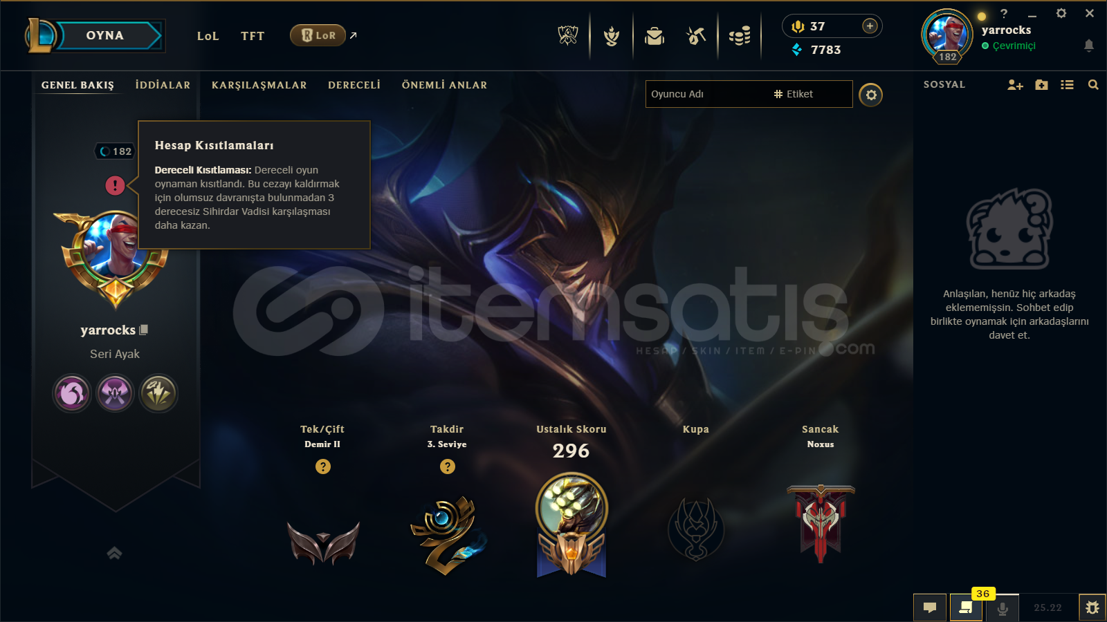🔷 League of Legends Bilgileri🔹 Sunucu: TR🔹 Level: 182🔹 Sıralama:• Tek/Çift: Demir 2• Esnek 5v5: Demir 3🔹 Şampiyonlar: 115 adet🔹Kostüm Sayısı: 71🔹 Mavi Öz: 7783📊 OP.GG Profili : https://op.gg/tr/lol/summoners/tr/yarrocks-1688. Hesapta 3 maç dereceli girememe cezası var.