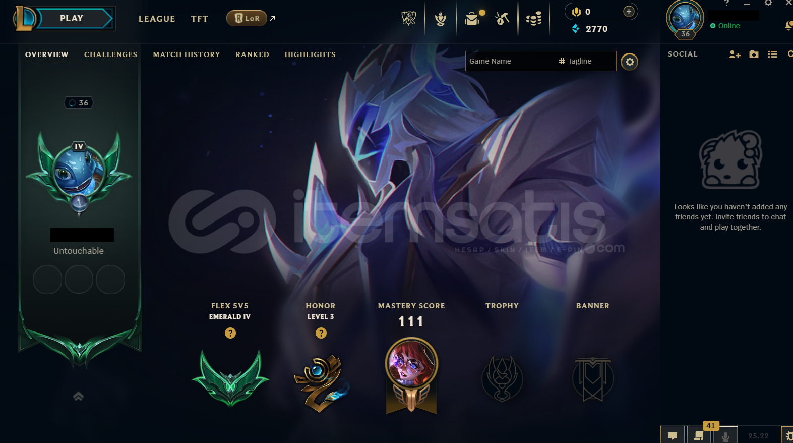 Hesap TR Tek/Çift Plat 1 - 9 Lp - 78 Winrate 26 Win 7 Lose - Esnek Zümrüt 4 - 2 Lp - 100 Winrate 5 Win 0 Lose TR LoL Hesabıdır. Geçen Sezonu Zümrüt Bitirmiştir.
