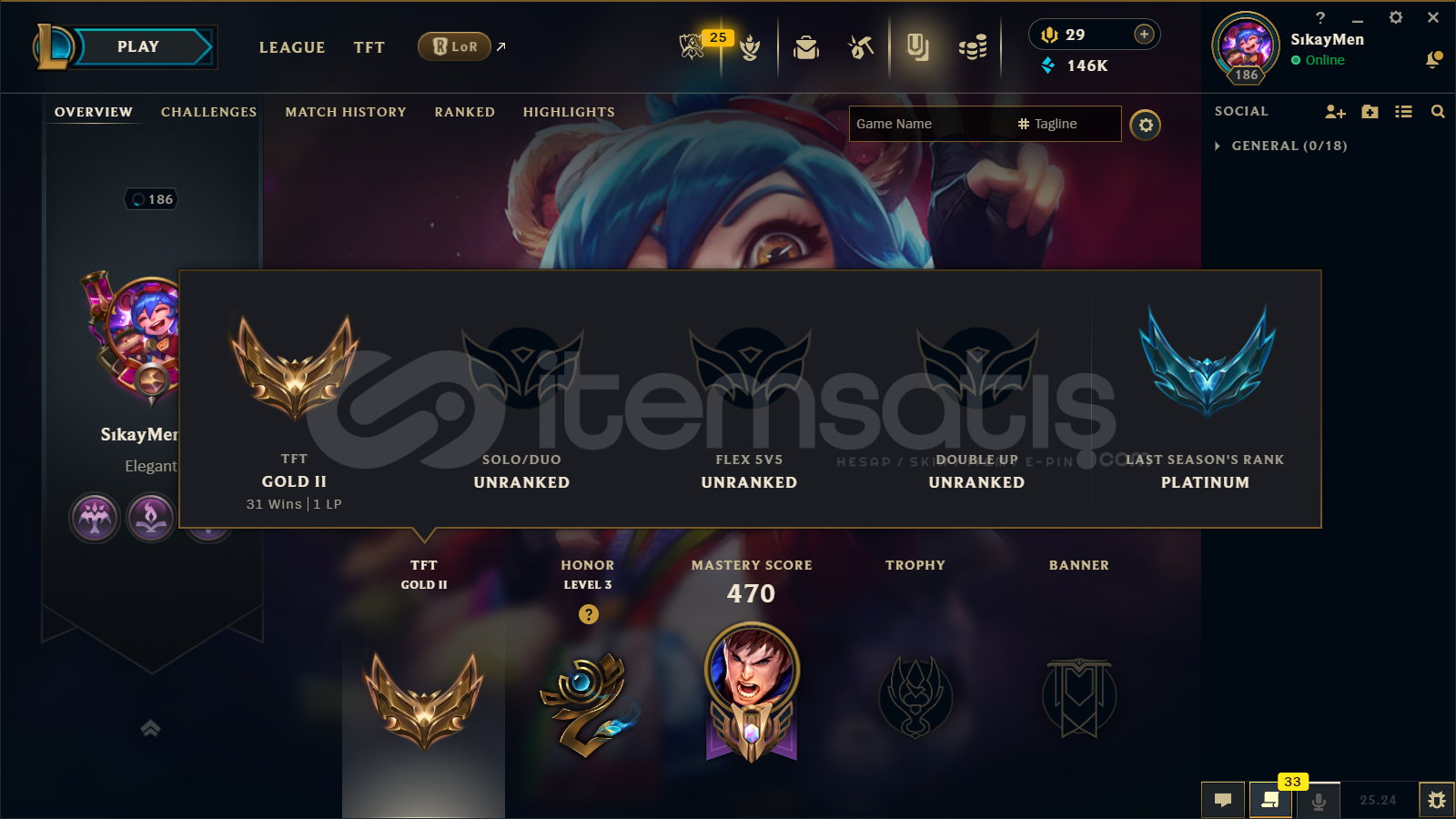 🔷 League of Legends Bilgileri🔹 Sunucu: TR🔹 Level: 186🔹 Sıralama:• Tek/Çift: Unranked• Esnek 5v5: Unranked🔹 Mavi Öz: 146 bin🔹 Şampiyon Sayısı : Hepsi açık🔹 Kostüm Sayısı: 79📊 OP.GG Profili : https://op.gg/tr/lol/summoners/TR/S%C4%B1kayMen-TR1✅ Hesaplarımın Tamamen Arkasındayım...