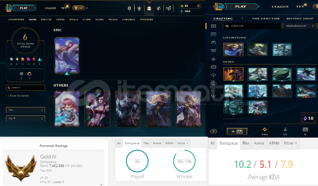 -86 winrate vardır.-Takdir seviyesi 4 hesaptır.-Ganimetini fotoğraflara ekledim.-10 cevher vardır.-6 kalıcı skin vardır.-50 hero vardır.-Hesap yüksek mmrdır. 38 alır isteyene opgg gönderebilirim.-Hiçbir banı yoktur.-Yüksek KDAdır.-İsim değiştirme hakkı vardır.-Handmade hesaptır.-Mail değiştirilecektir dm atmaktan çekinmeyin.