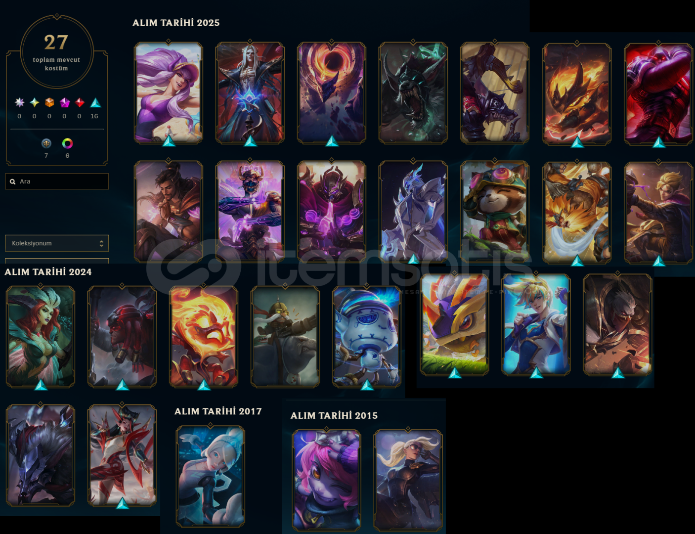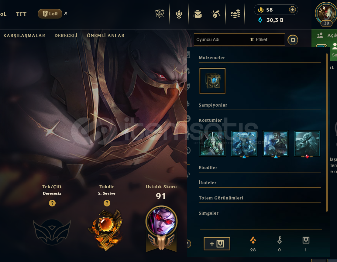 UNRANKED TAMAMEN ELLE KASILMIŞ HANDMADE 2015 ÇARIHERO : 75SKIN : 27MAVİ ÖZ: 30,3KLEVEL : 30-///// KOSTÜMLER - ŞAMPİYONLAR /////Direnişçi Yorik- Zebani Amumu - Urf Pilotu Corki - Porselen Amumu - Işık Fırtınası Wukong - Yağmacı Warwick - Efsanebaz Zyra - Kış Mucizesi Orianna - Riot Kızı Tristana - Riot Kyle - Yıldız Muhafızı Ezreal - Vahşi Batılı Sion - Kara O...